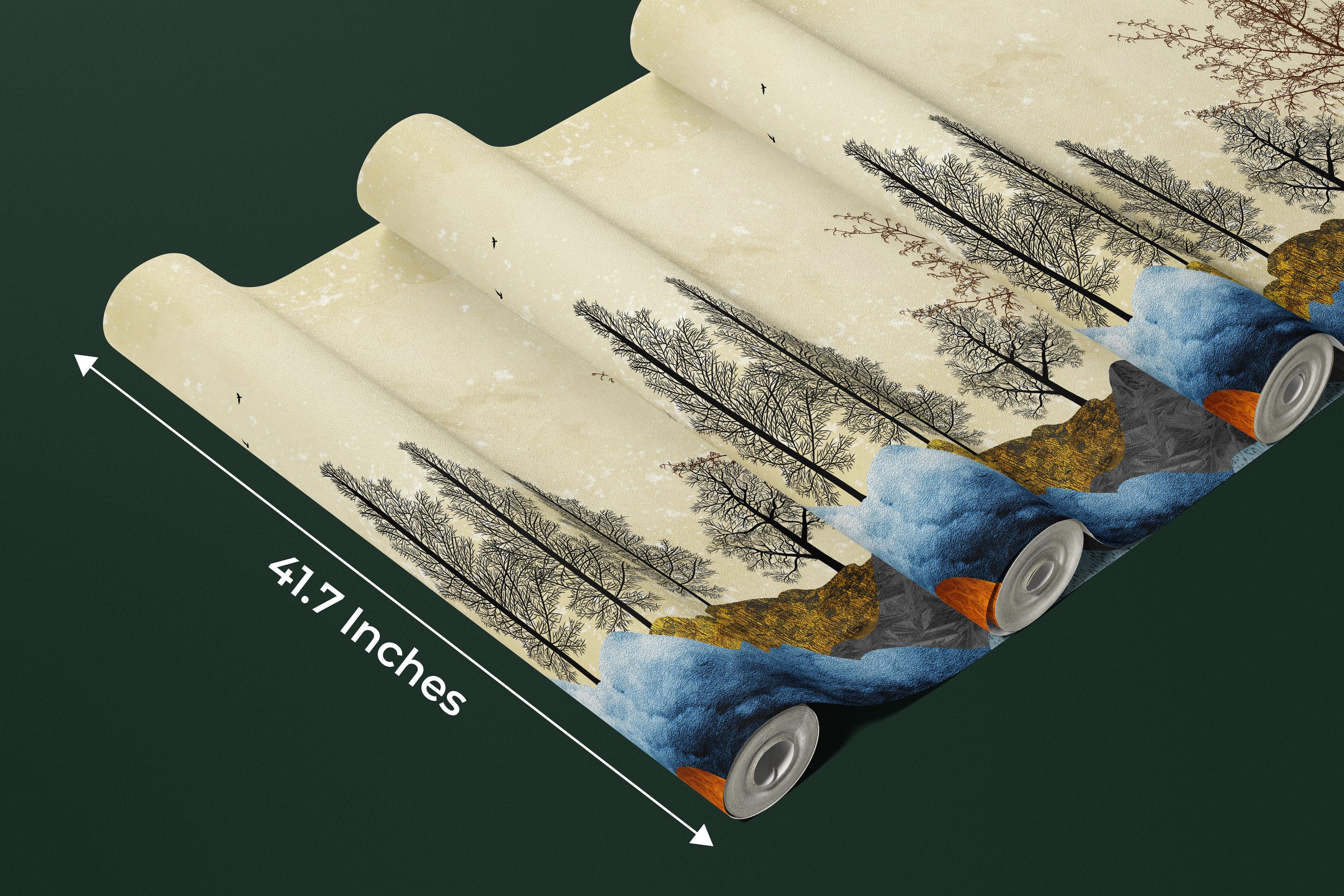 Golden Trees Wallpaper, Abstract Landscape Mural, Oversized Custom Size Wall Art, Non-Woven, Non-Adhesive, Modern Wall Paper, Removable