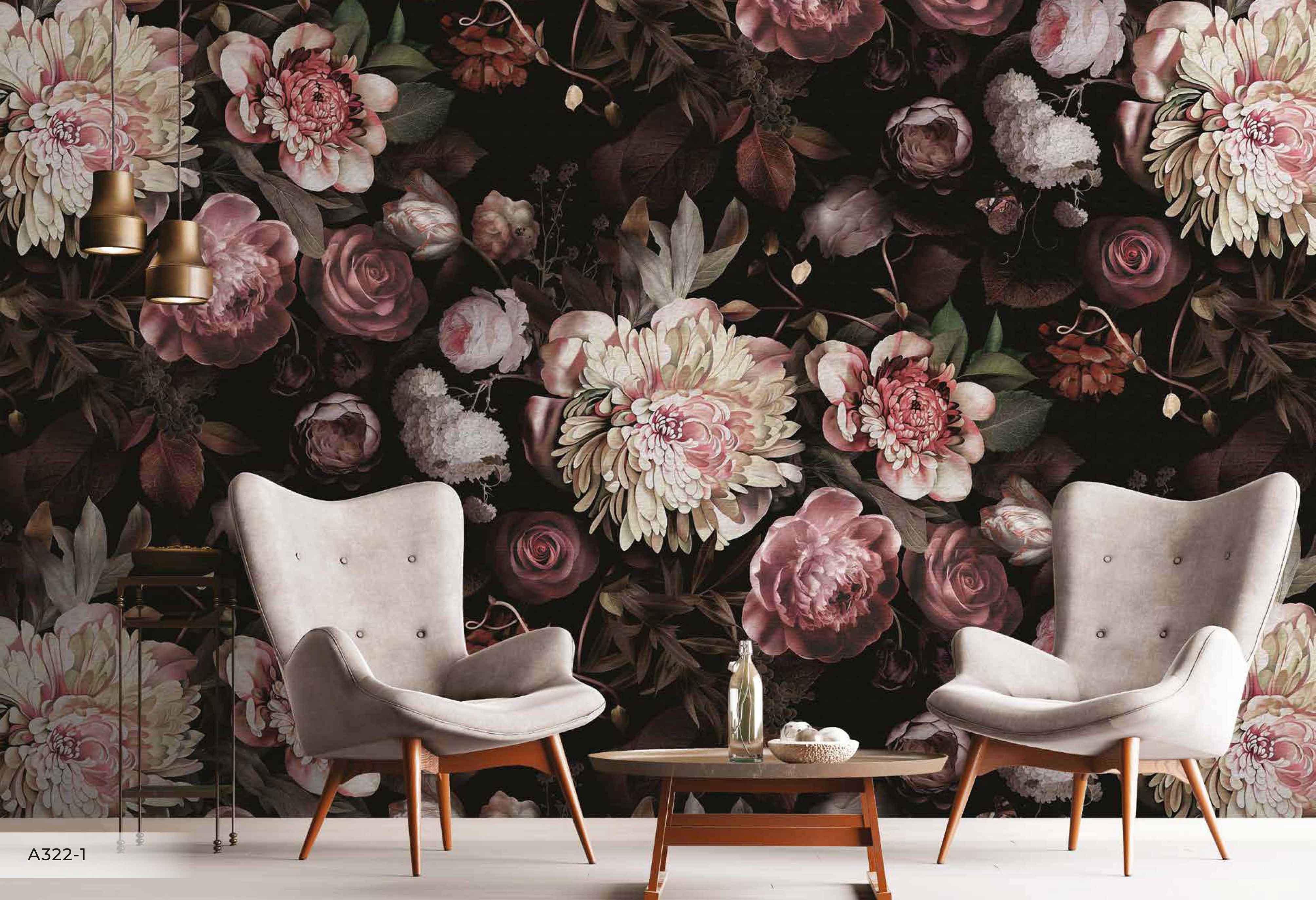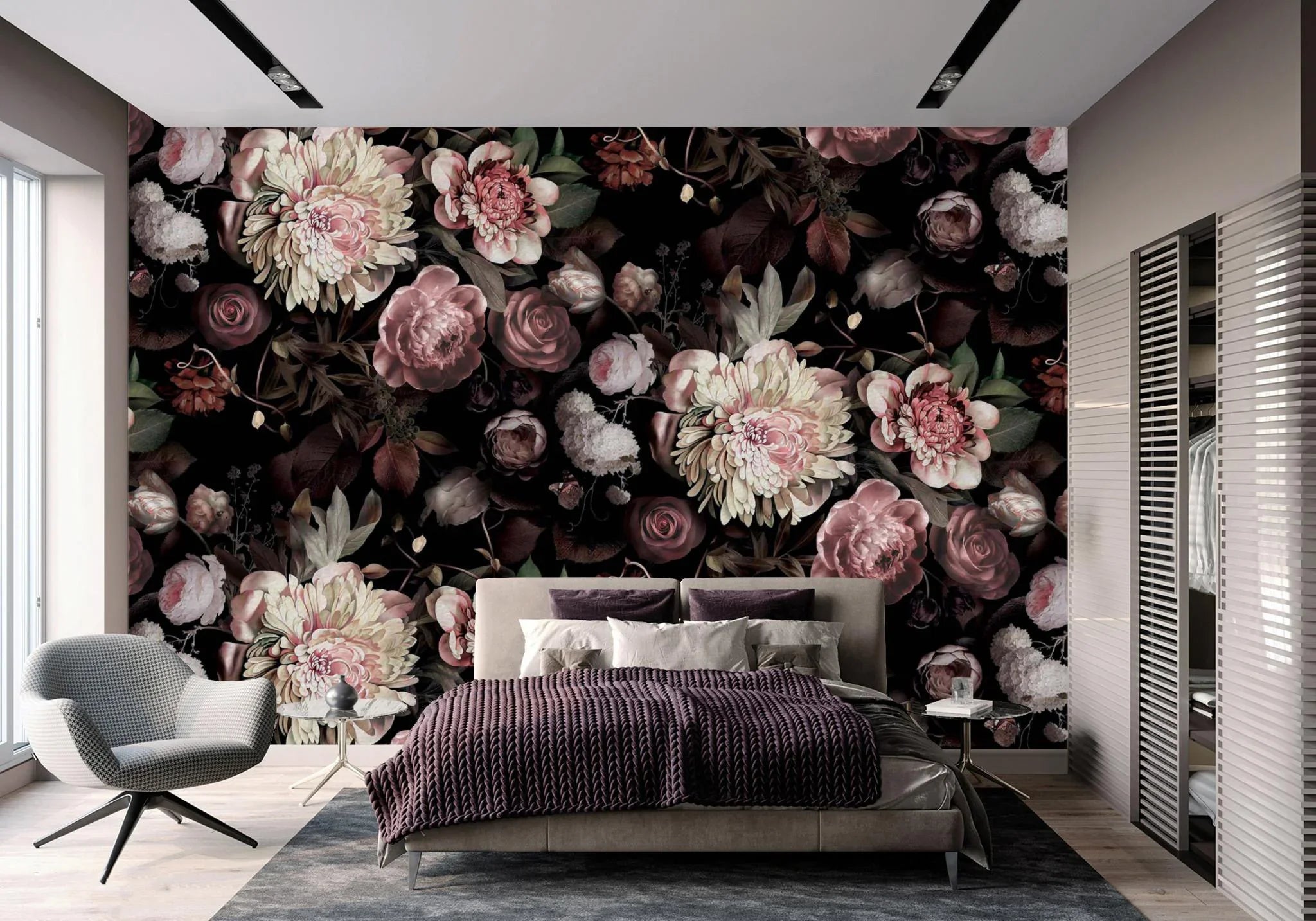 Floral Peony Wall Mural, Black Large Blooms Black Botanical Wallpaper,Home Decor Wall Art, Non-Woven, Non-Pasted, Removable, Washable