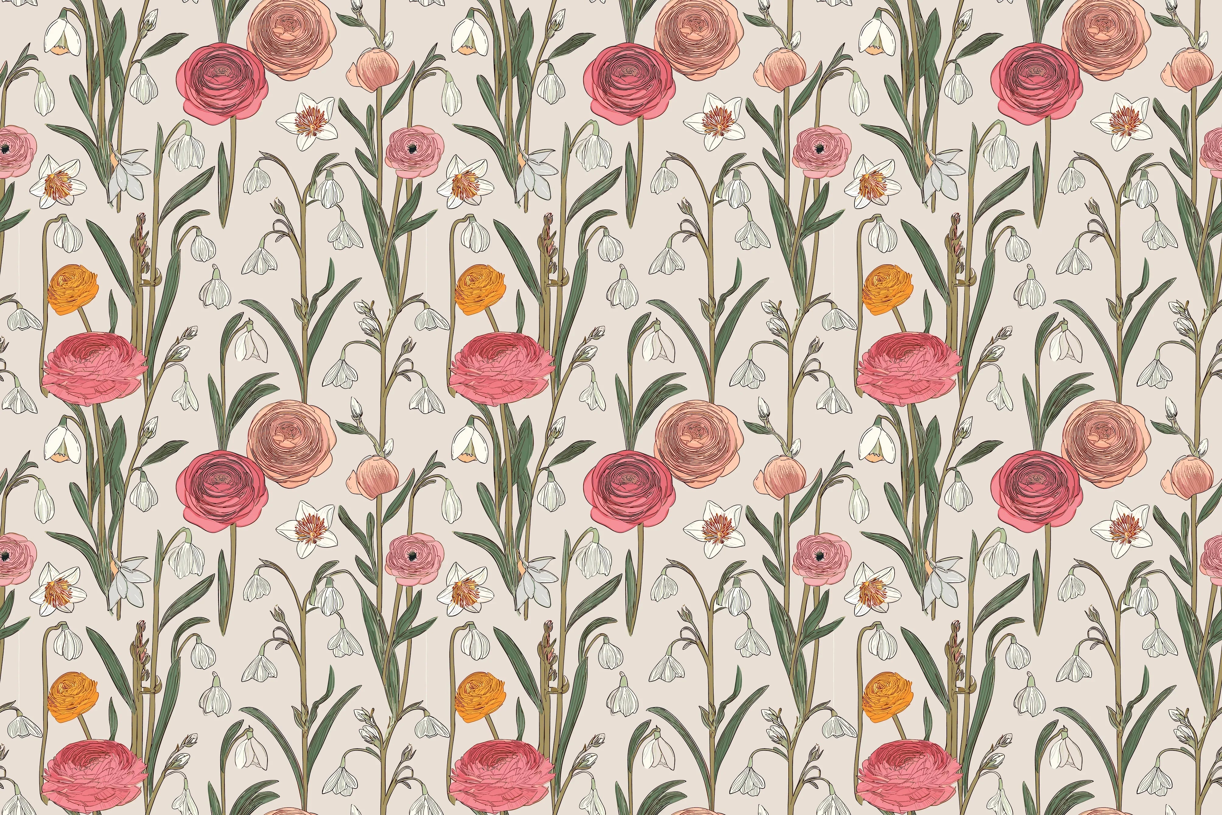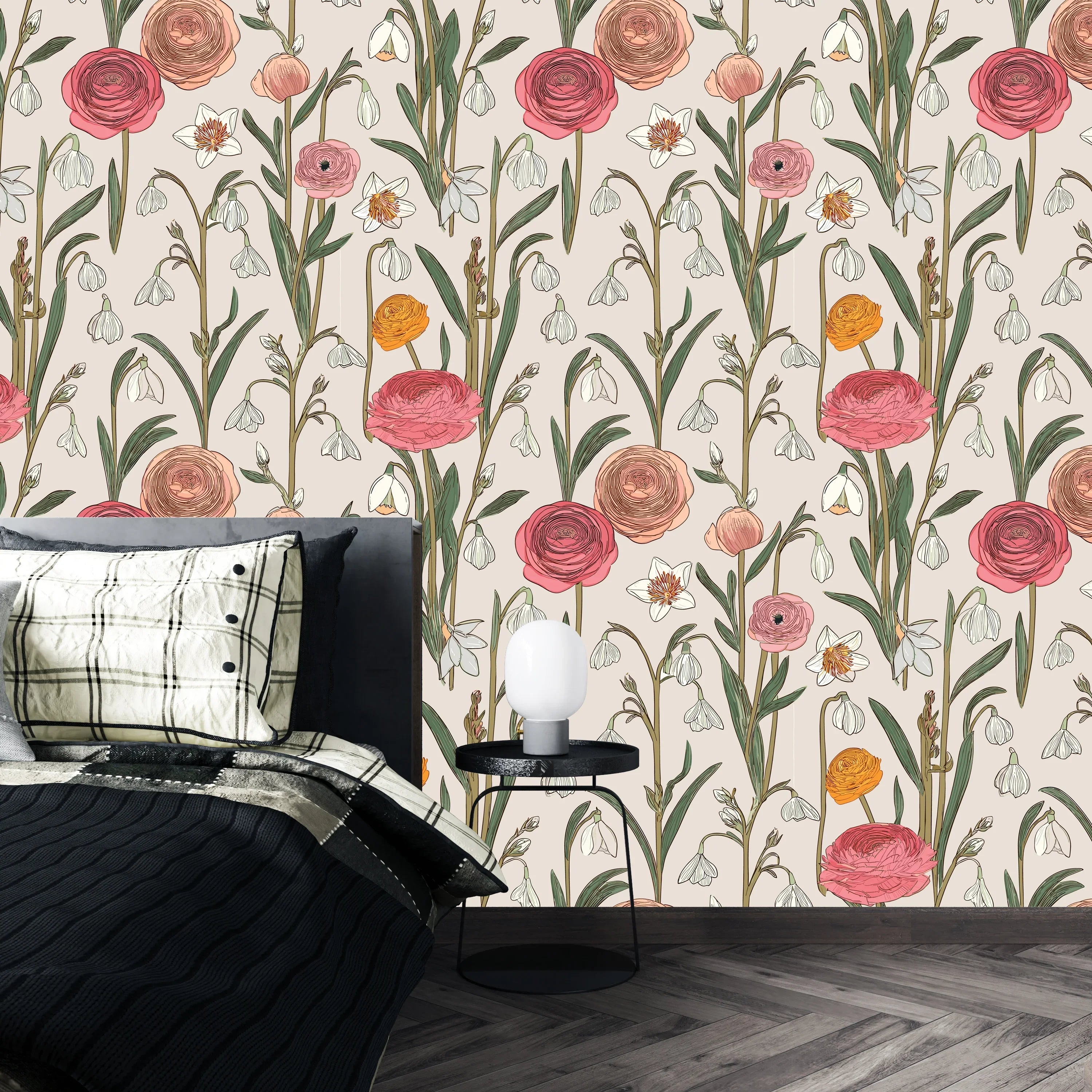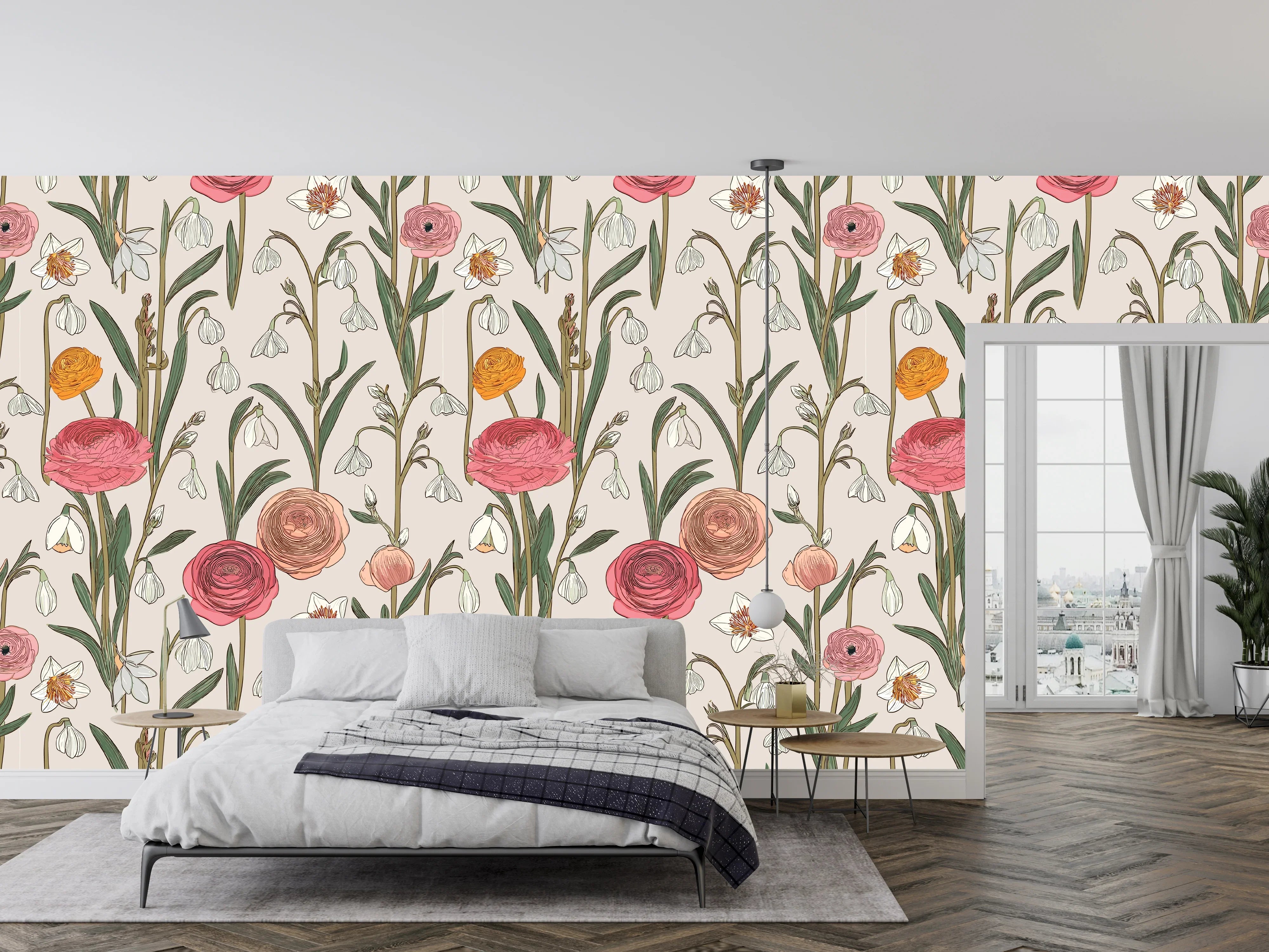 Abstract Handmade Floral Wallpaper, Seamless Pattern Mural, Oversized Custom Size Wall Art, Non-Woven, Non-Adhesive, Modern Wall Paper, Removable