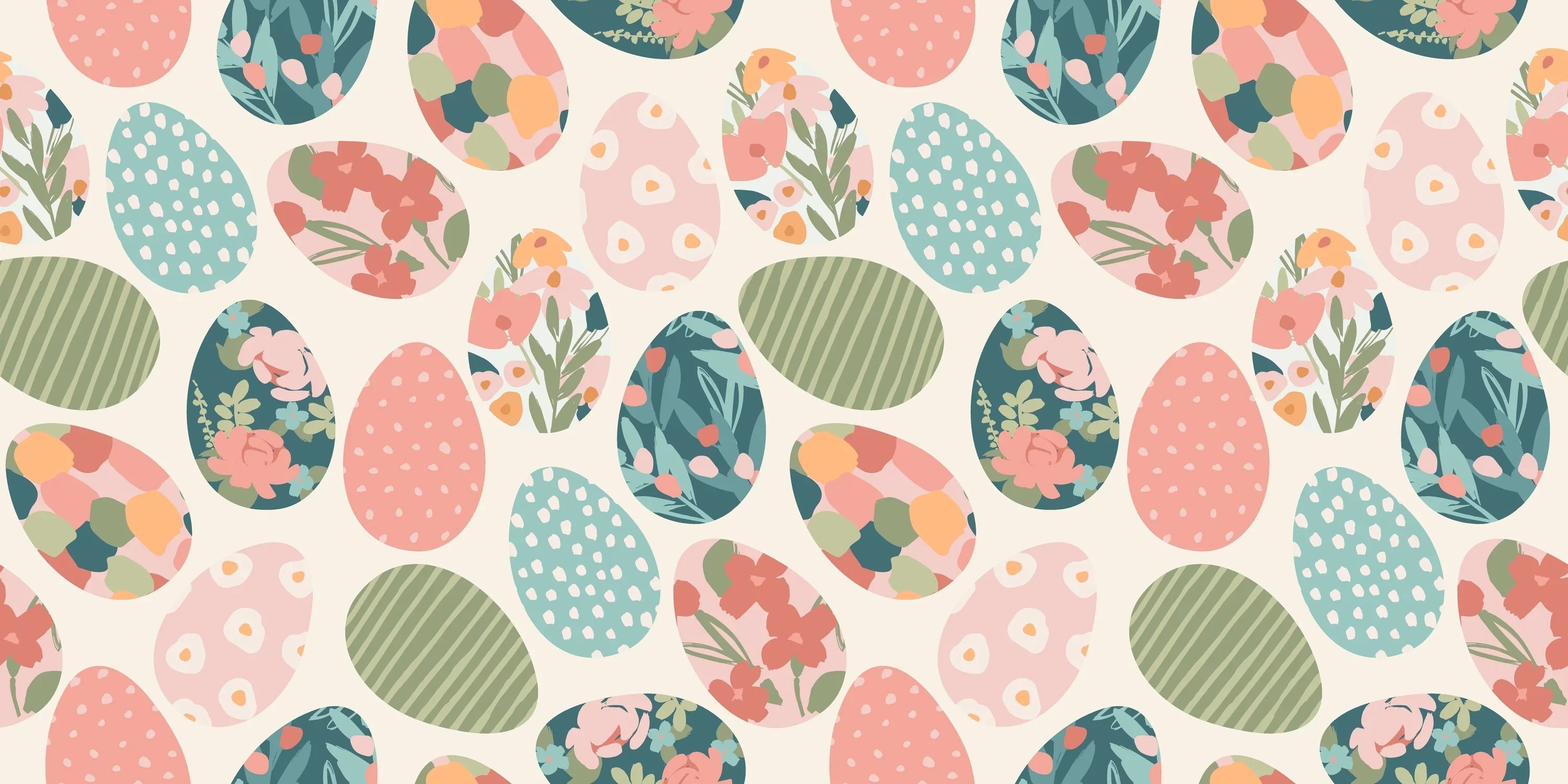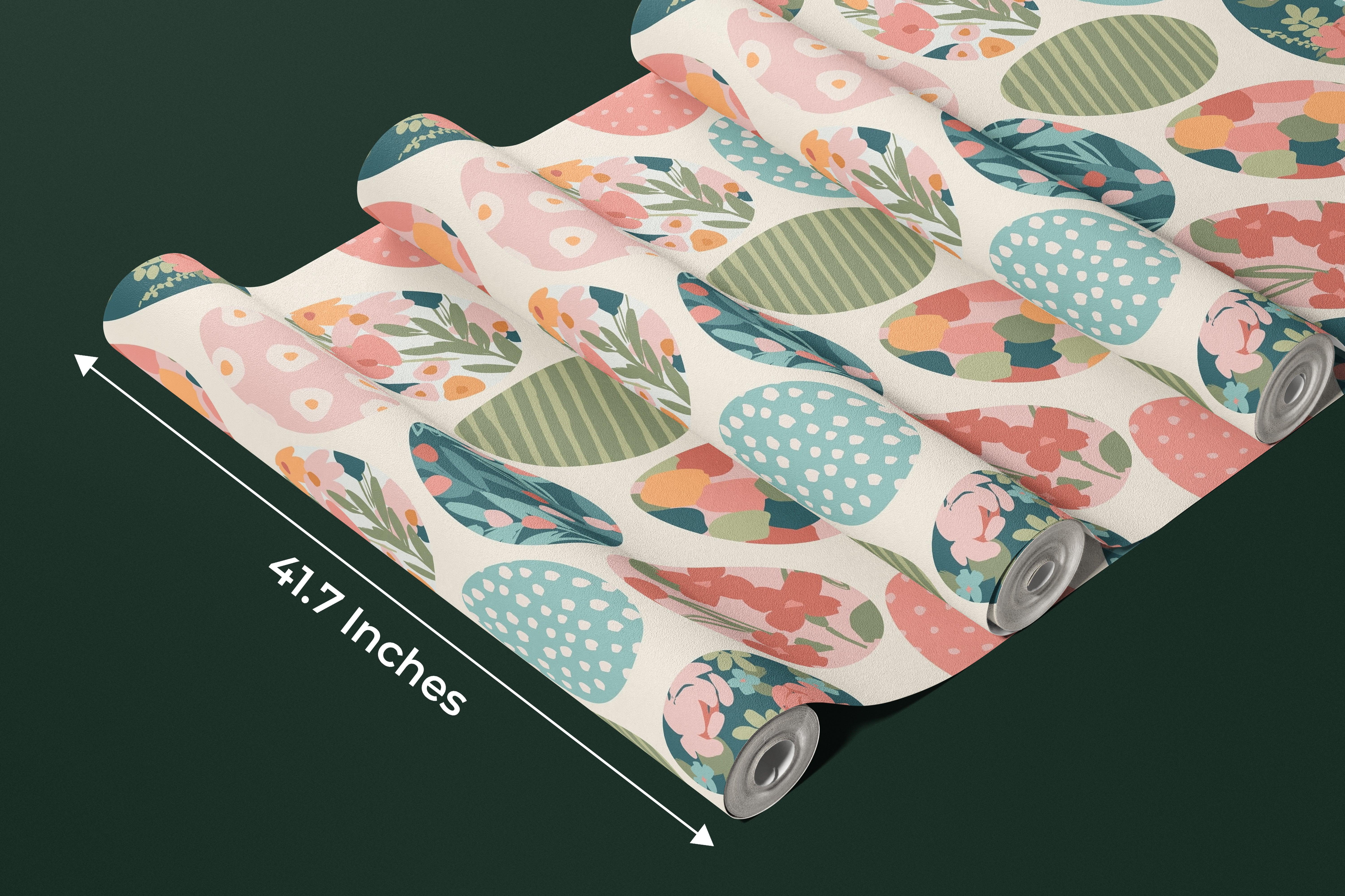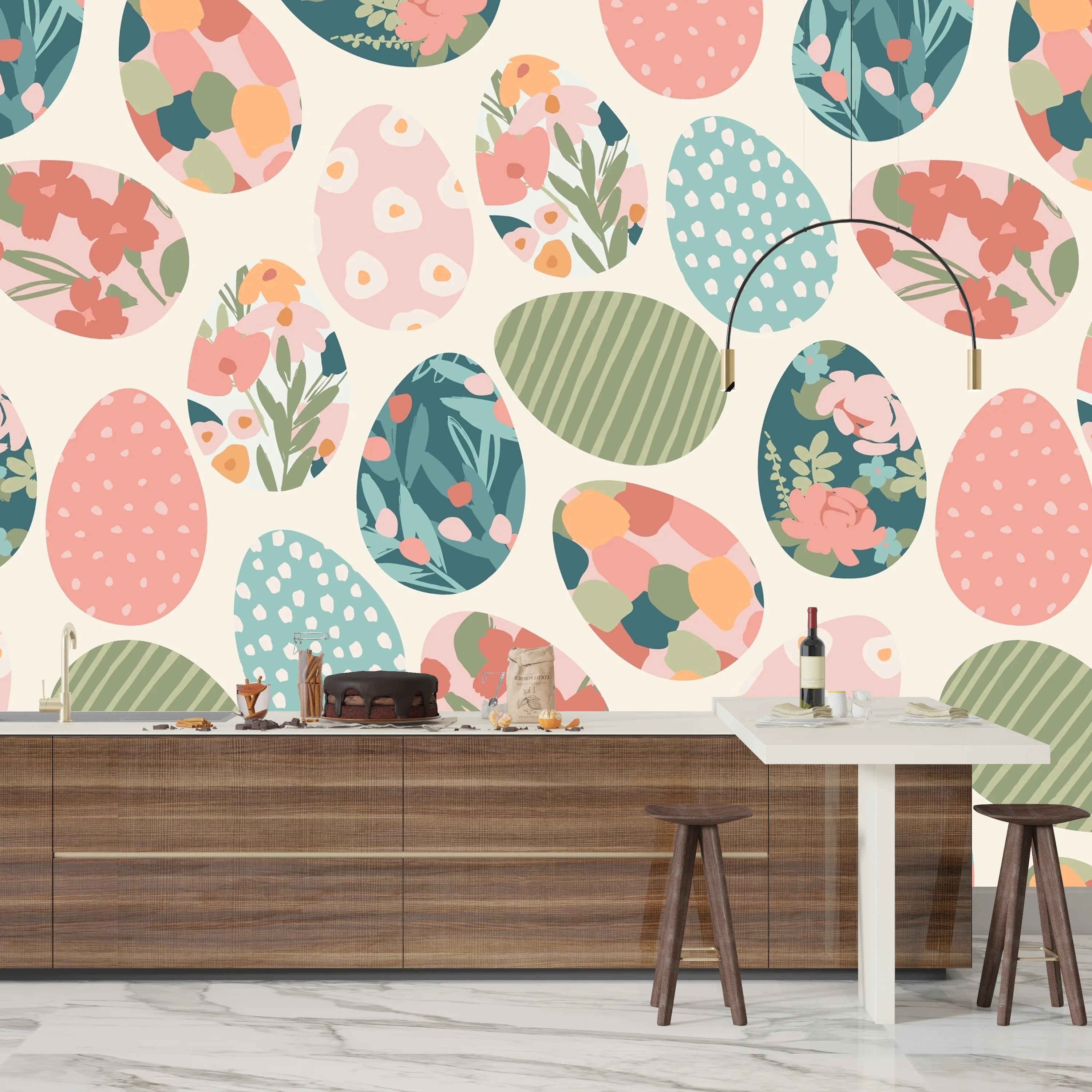 Easter Eggs with Abstract Flowers Wallpaper, Seamless Pattern Mural, Oversized Custom Size Wall Art, Non-Woven, Non-Adhesive, Modern Wall Paper, Removable