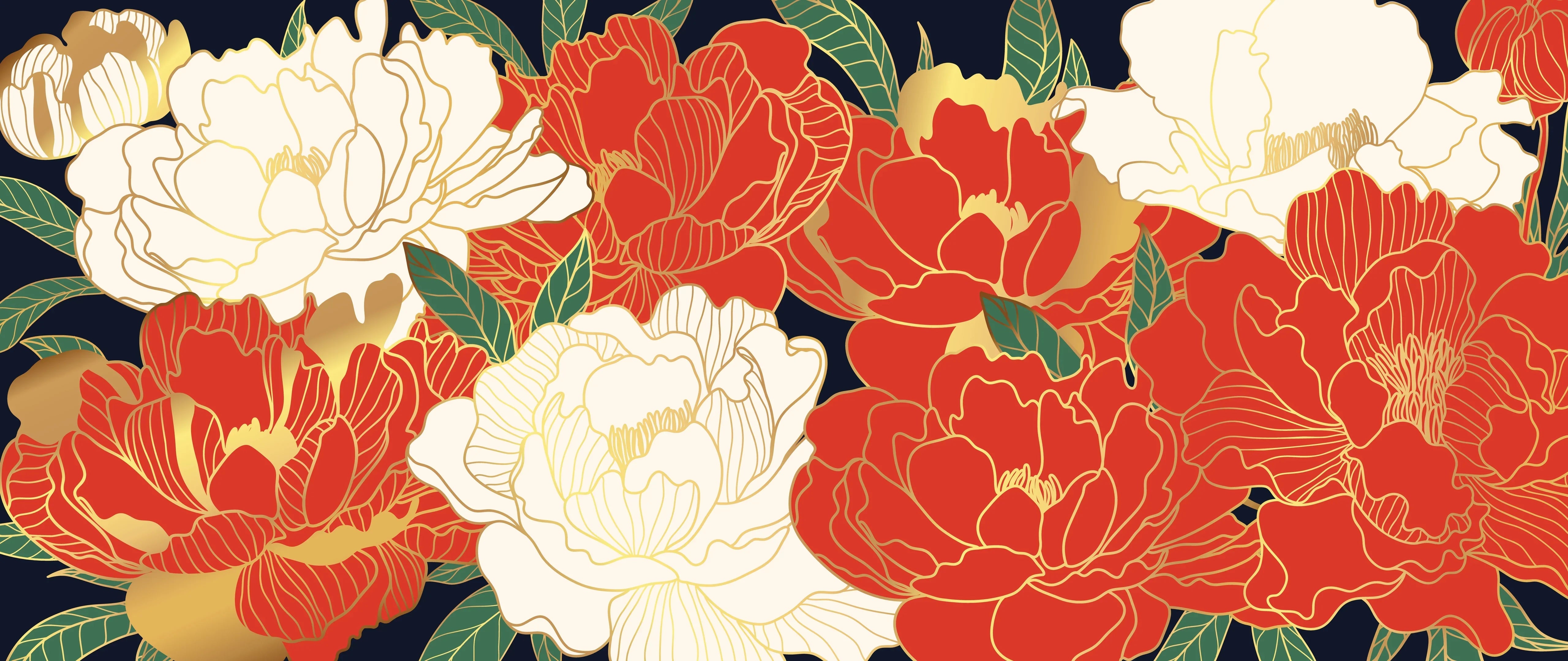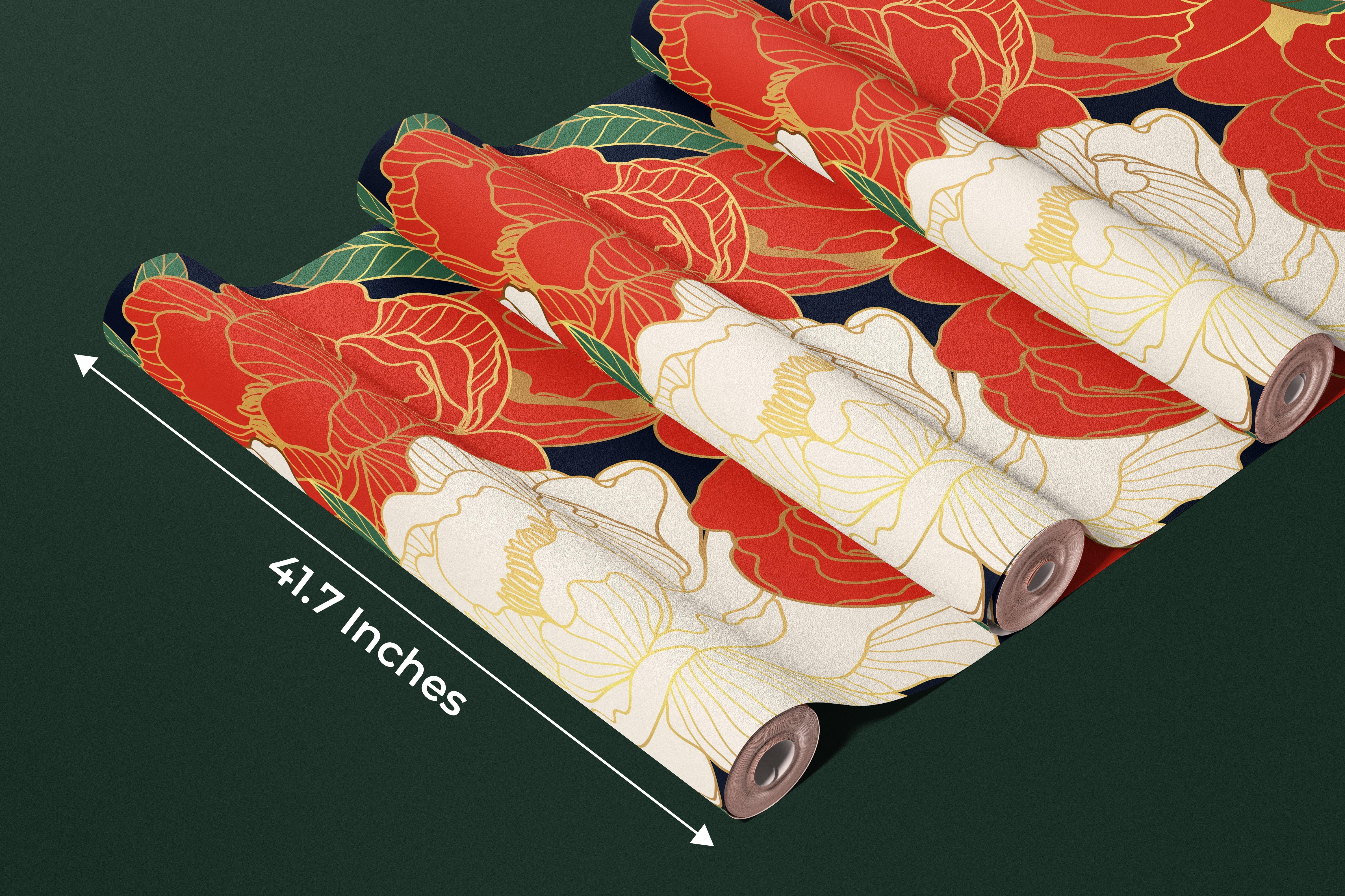 White and Red Peonies Wallpaper, Luxurious Gold Mural, Oversized Custom Size Wall Art, Non-Woven, Non-Adhesive, Modern Wall Paper, Removable