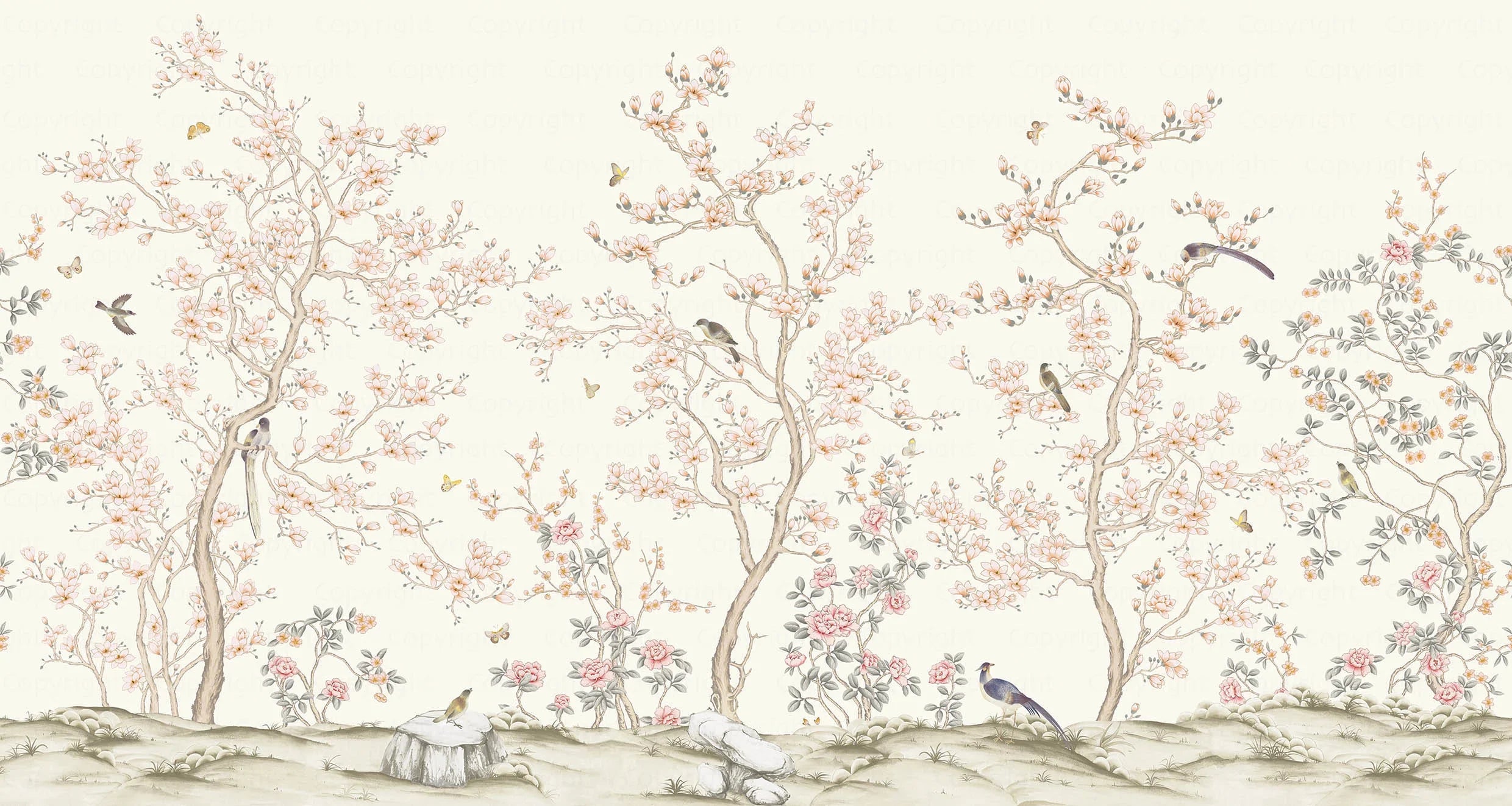 White Chinoiserie Floral Wall Mural, Birds Tree Flowers Wallpaper, Custom Size Wall Covering, Non-Woven, Non-Adhesive, Removable, Washable