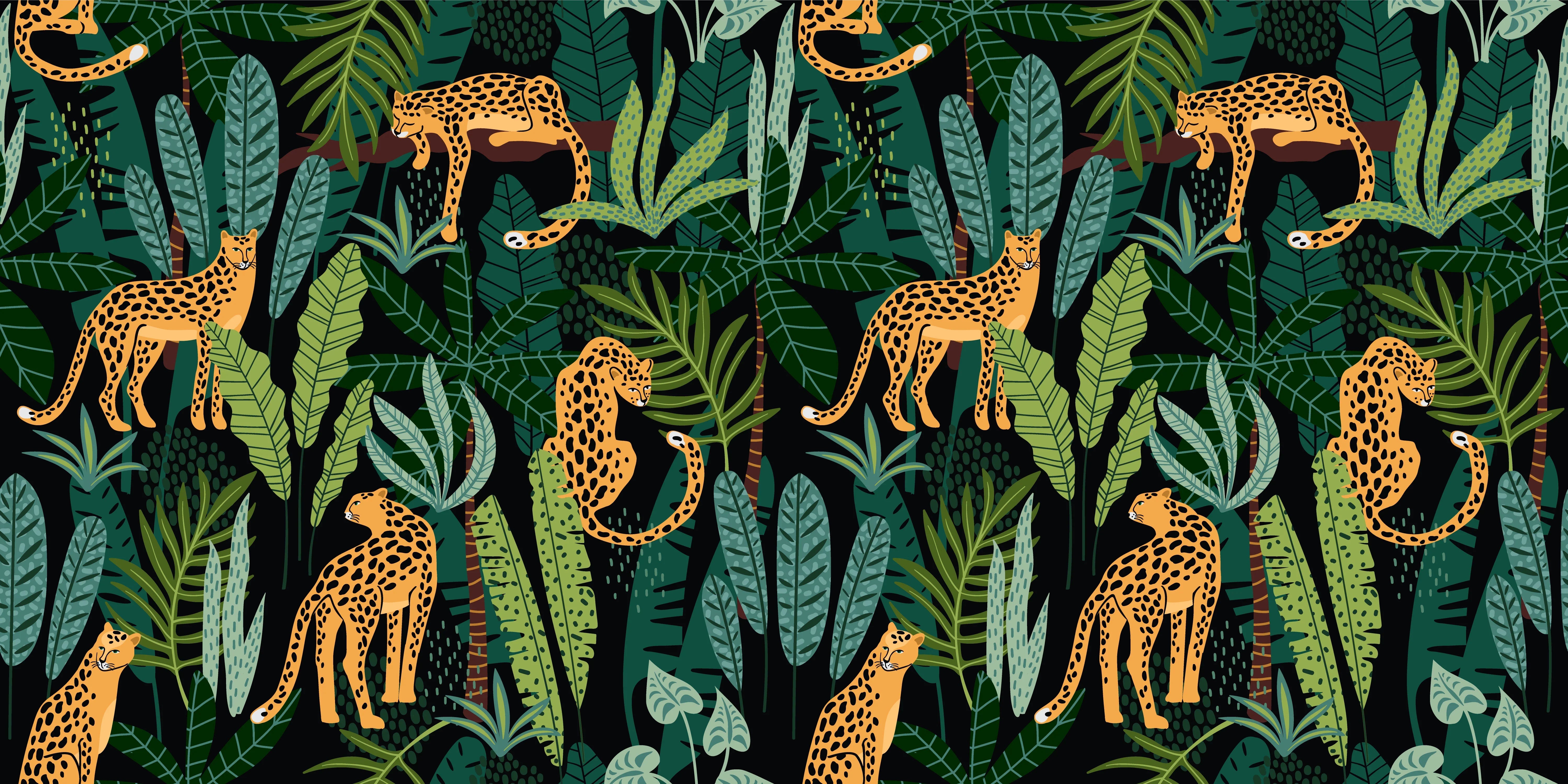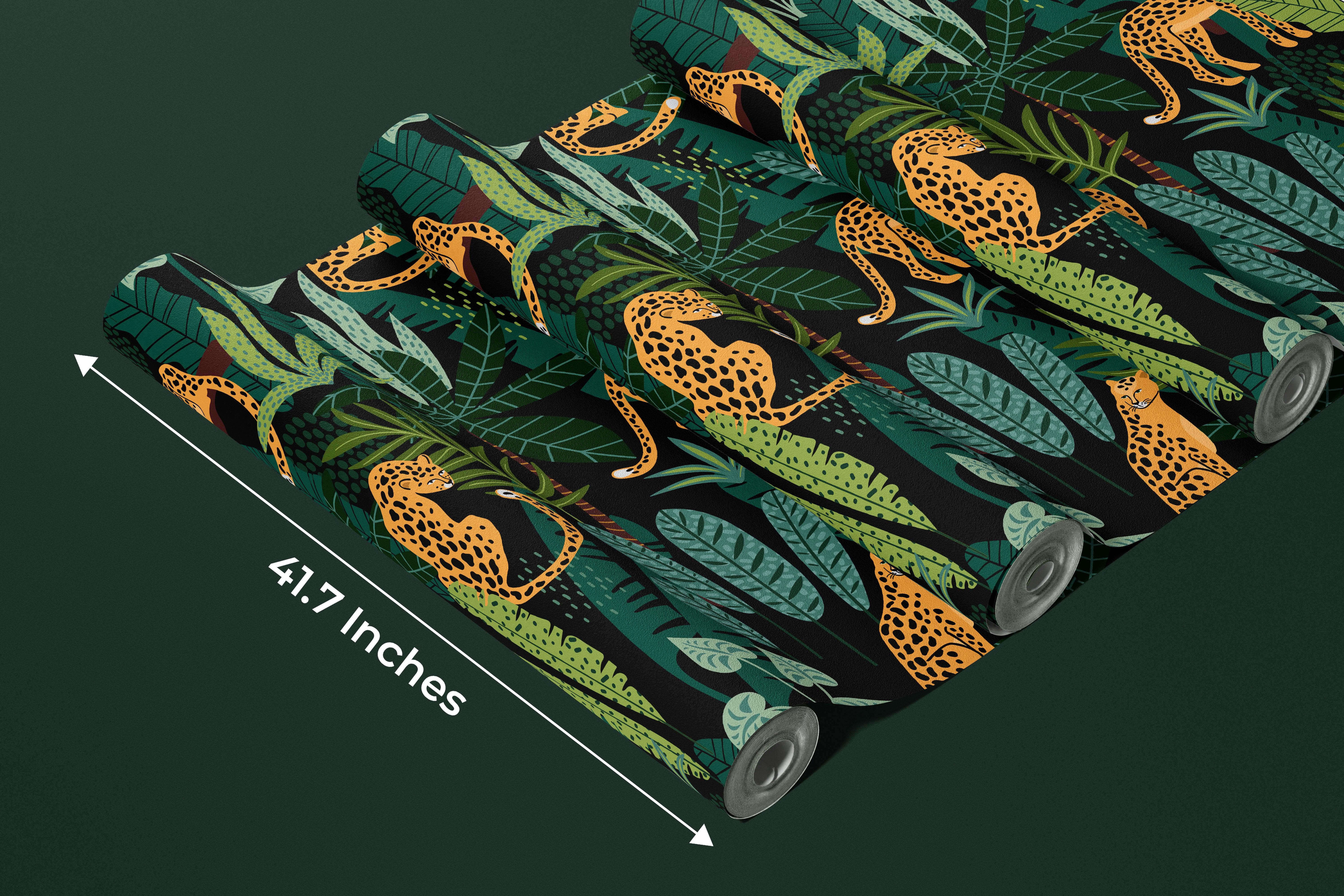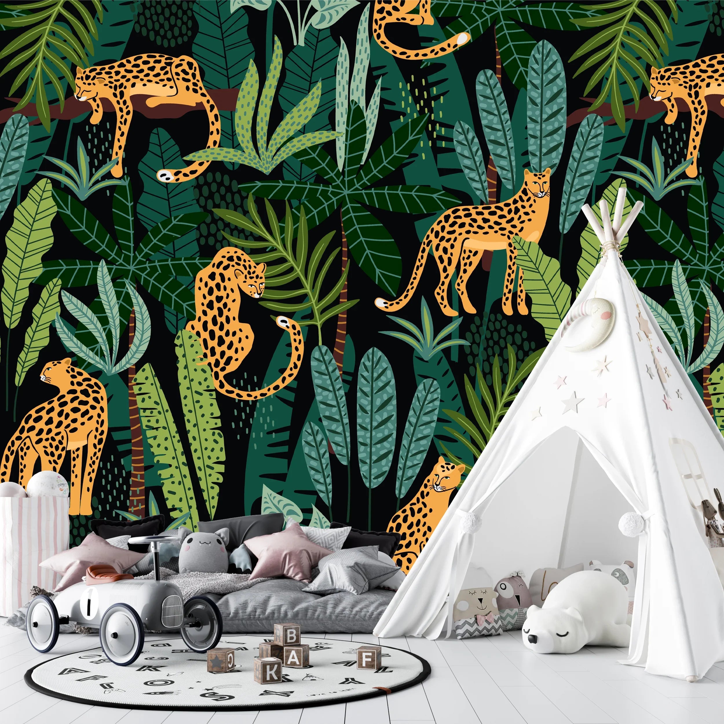 Leopards, Tropical Leaves Wallpaper, Seamless Pattern Mural, Oversized Custom Size Wall Art, Non-Woven, Non-Adhesive, Modern Wall Paper, Removable