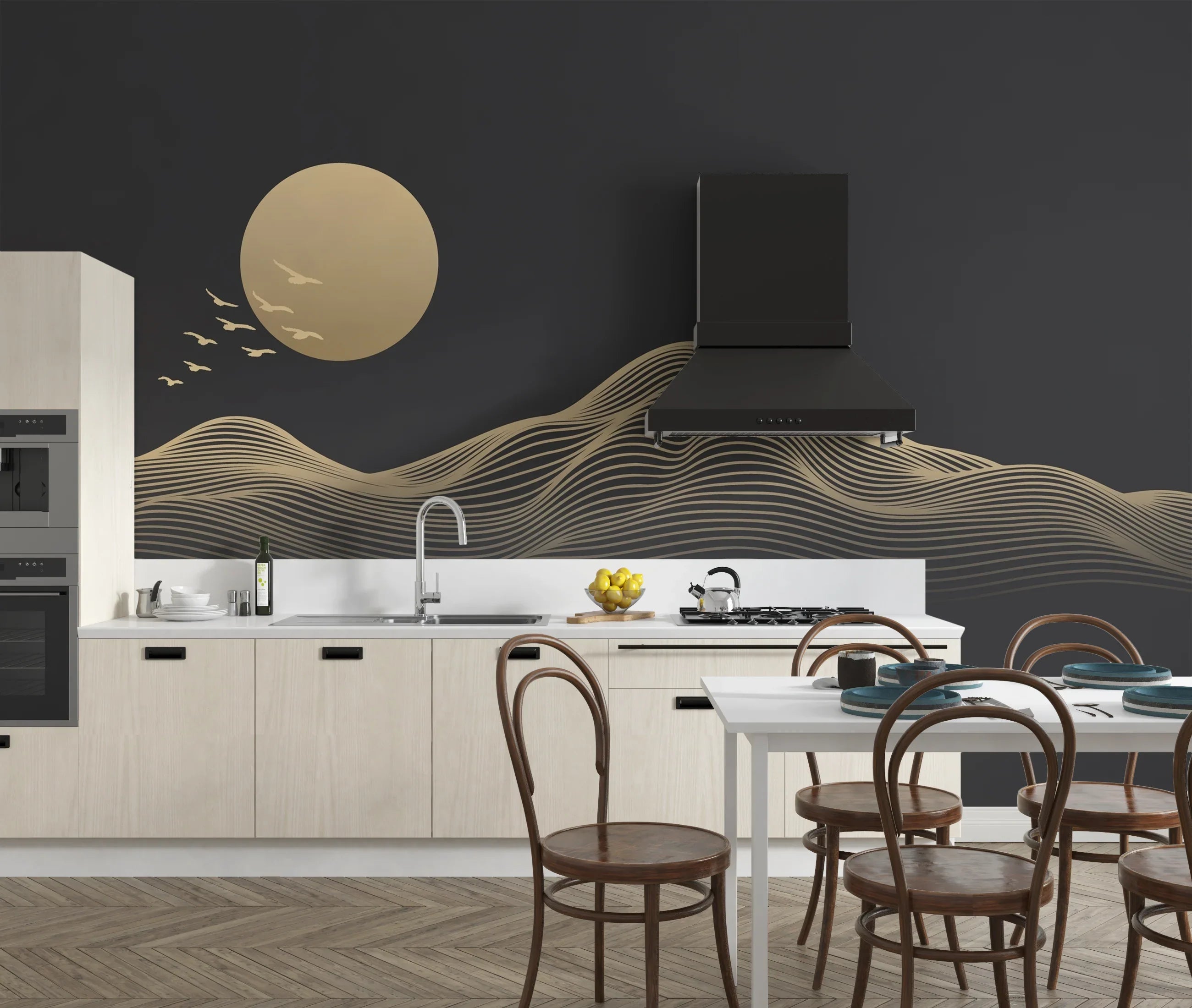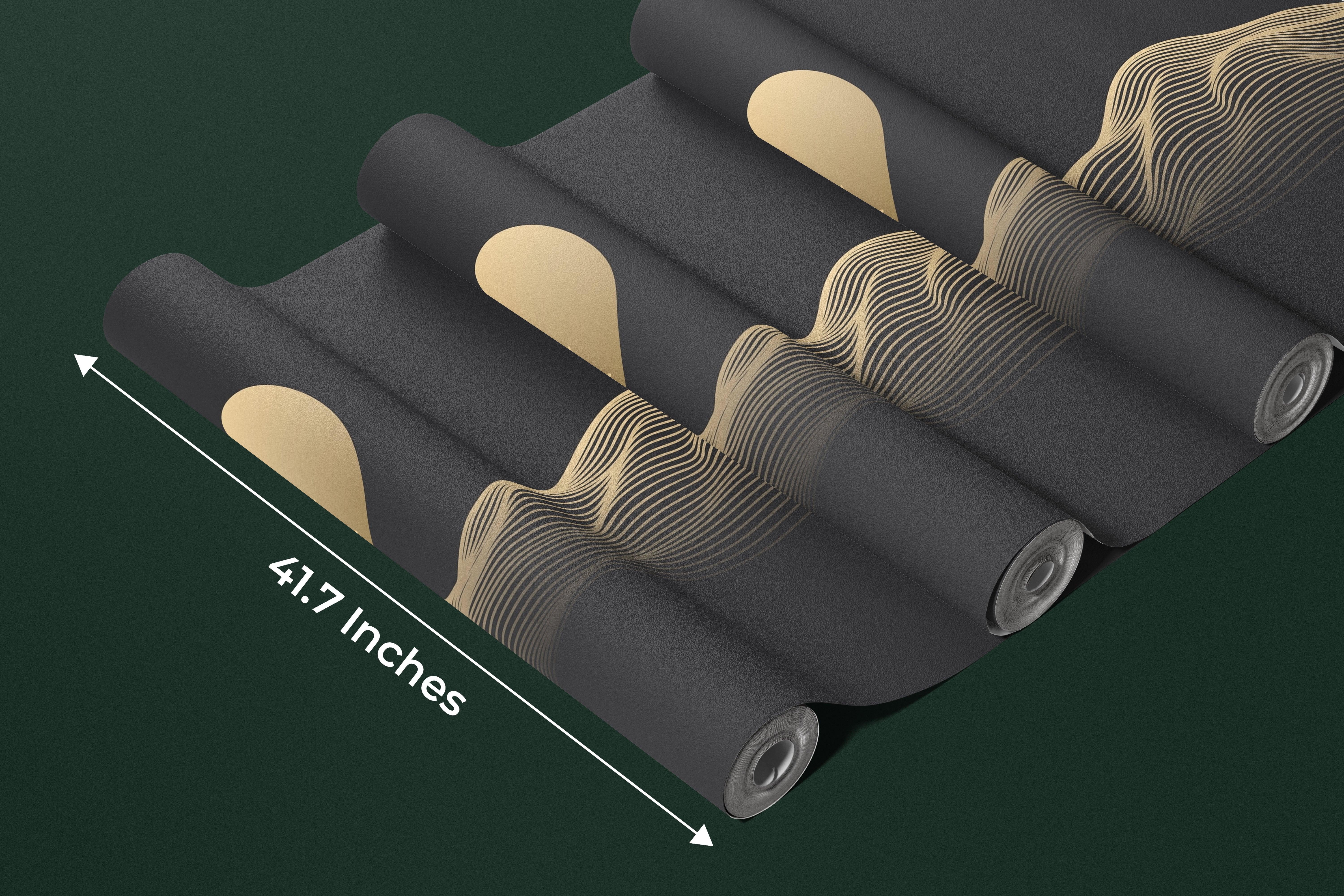 Abstract Gold Landscape Wallpaper, Mountain and Birds, Black Background Mural, Oversized Custom Size Wall Art, Non-Woven, Non-Adhesive, Modern Wall Paper, Removable