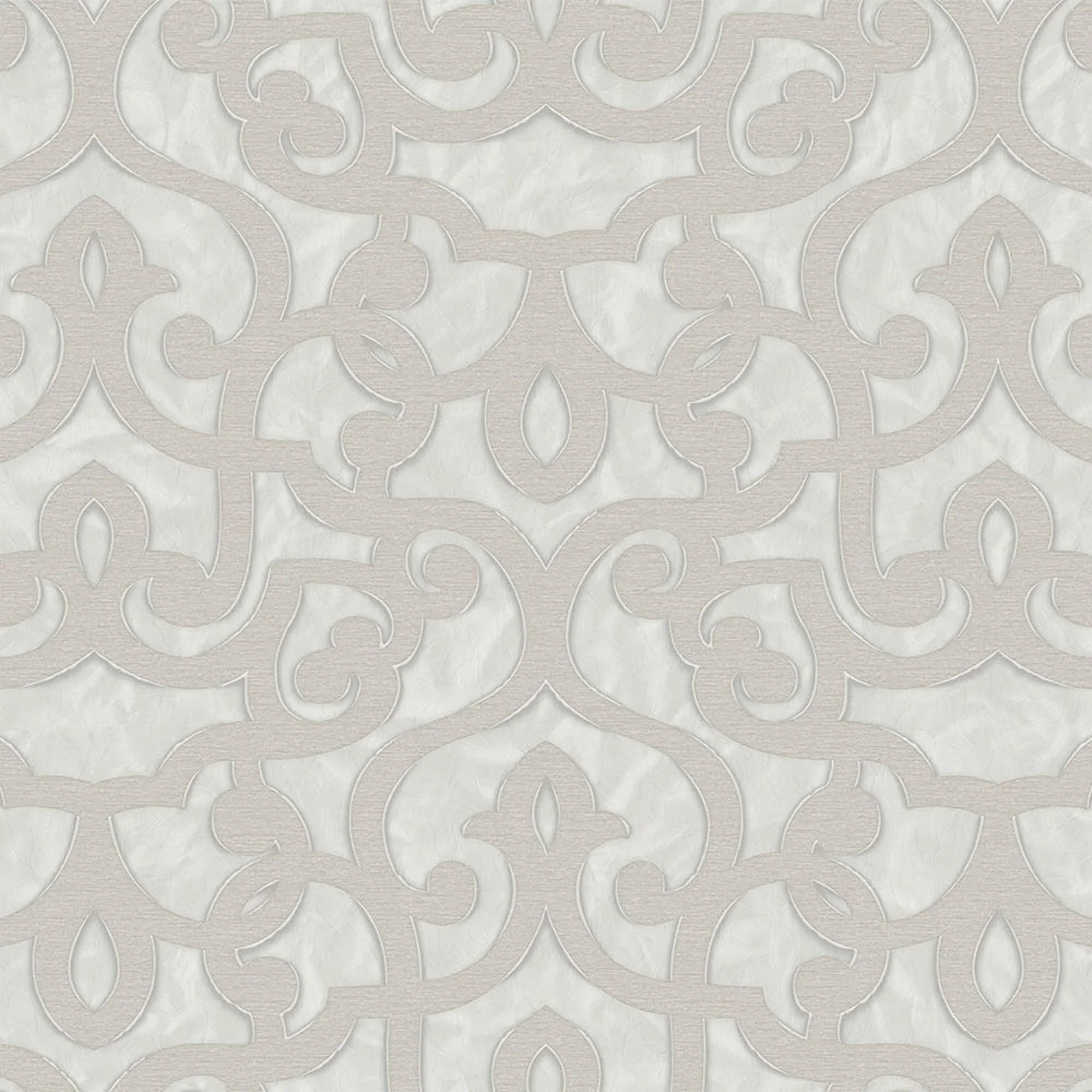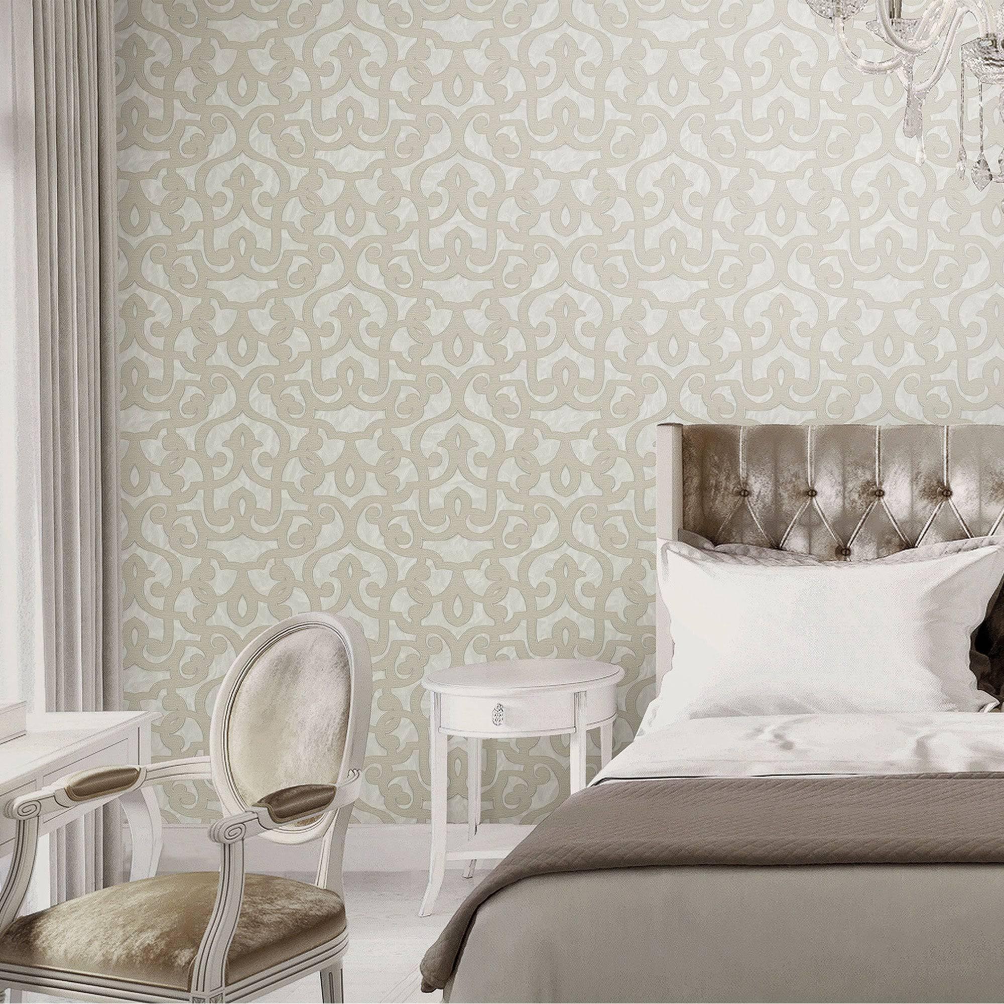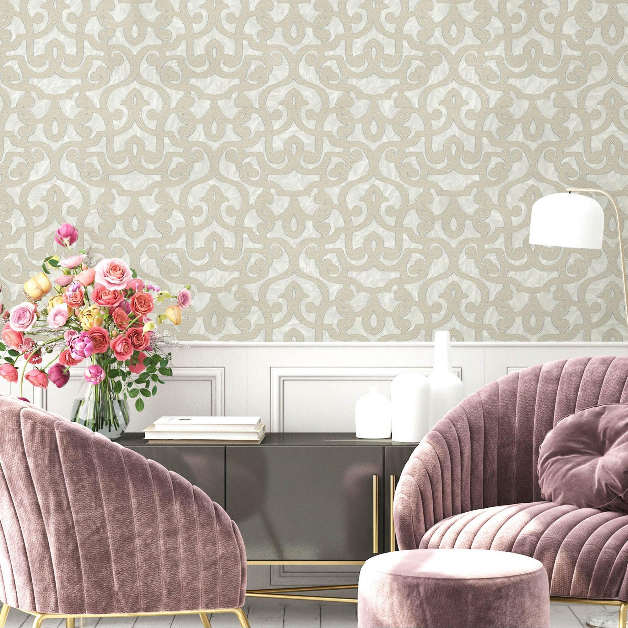 Beige Lace Trellis Wallpaper, Shiny Silver Gold Patterns Faded Colors Damask Design