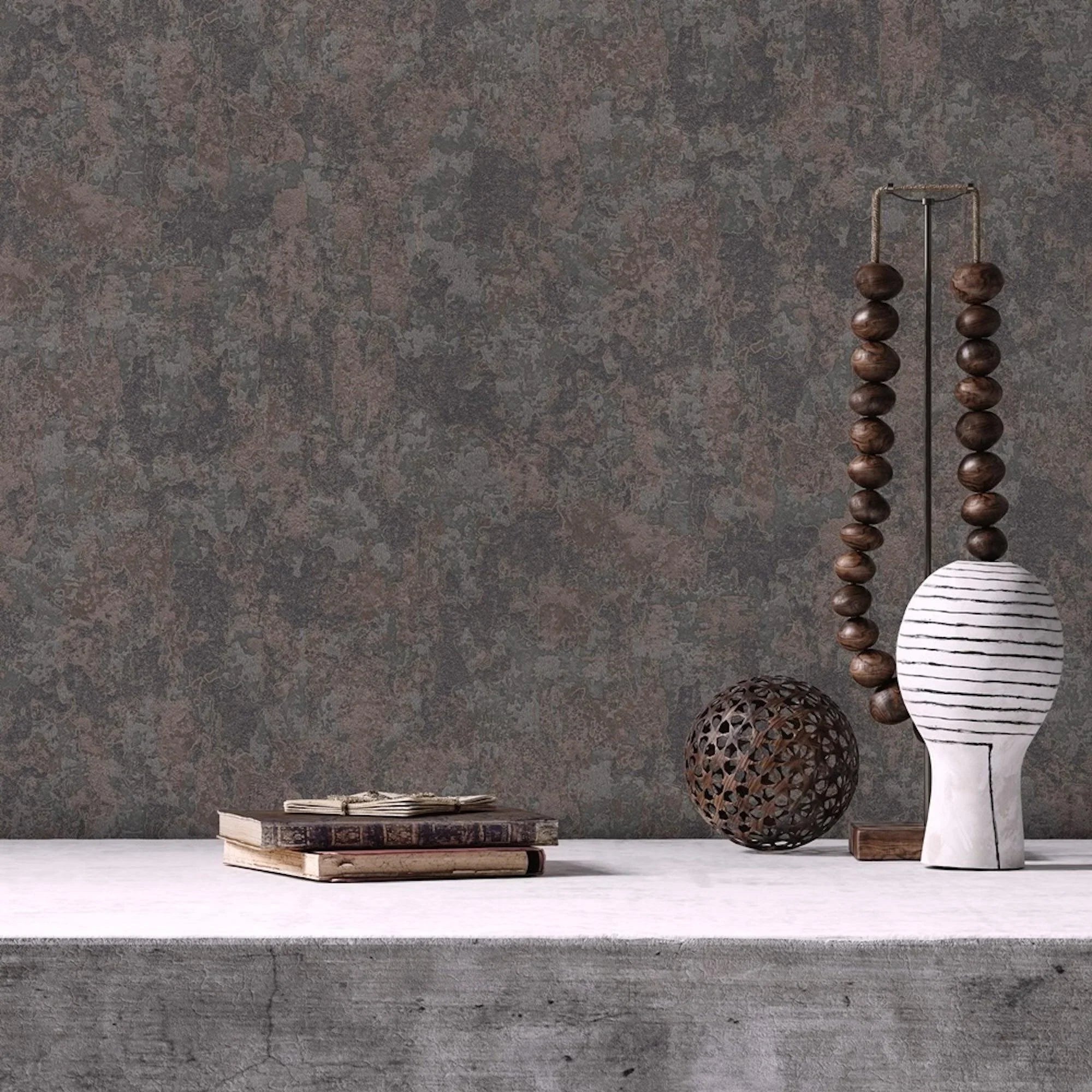 Brown Distressed Metallic Wallpaper, Deep Embossed Shiny Rustic Aged Industrial Design