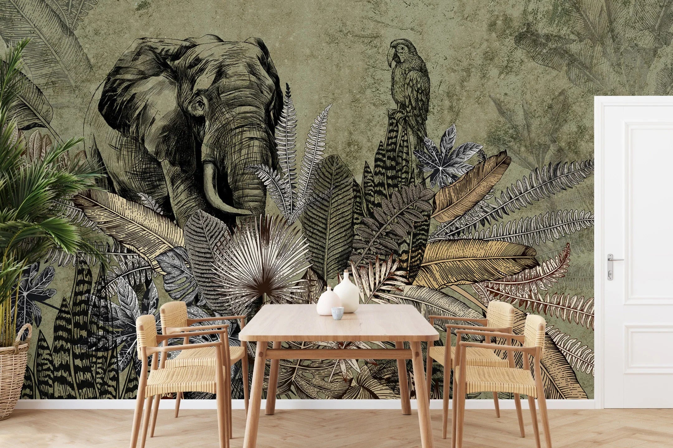 Elephant Jungle Wall Mural, Green Forest Animal Theme Wallpaper, Oversized Wall Art, Non-Woven, Non-Pasted, Removable, Exotic Wall Paper, Washable