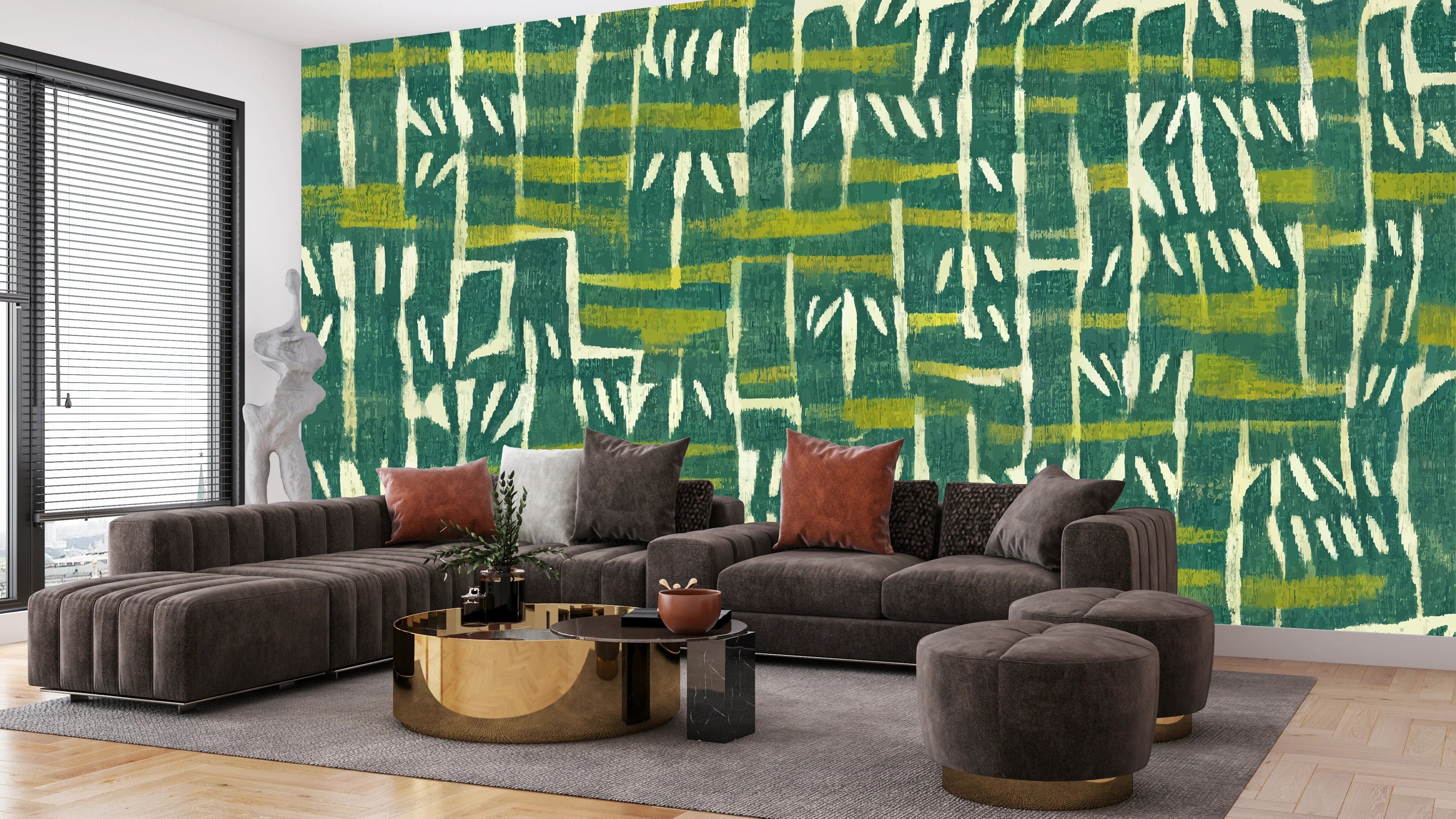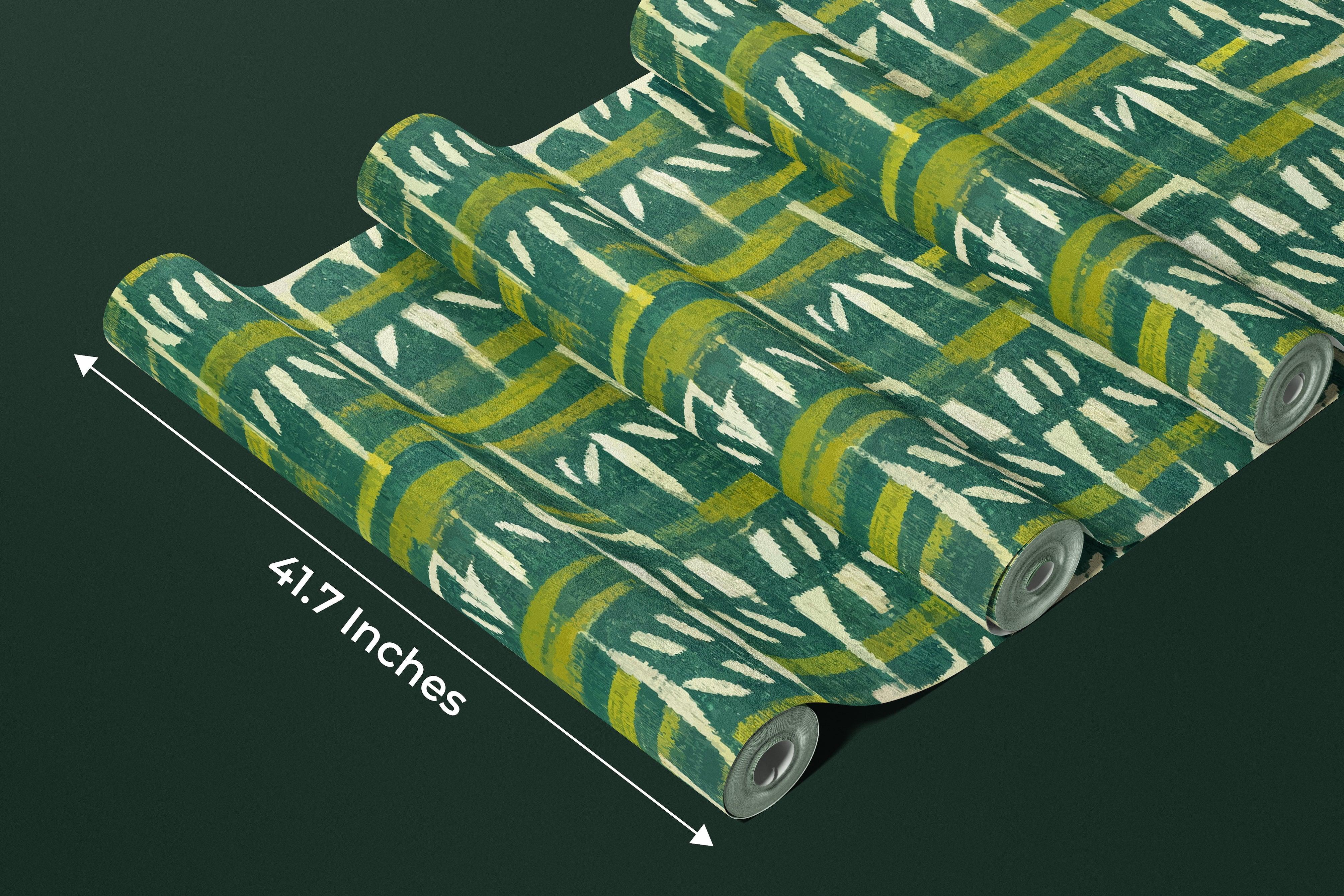 Ethnic Ikat Greenish Wallpaper, Handmade Boho Tribal Mural, Oversized Custom Size Wall Art, Non-Woven, Non-Adhesive, Modern Wall Paper, Removable