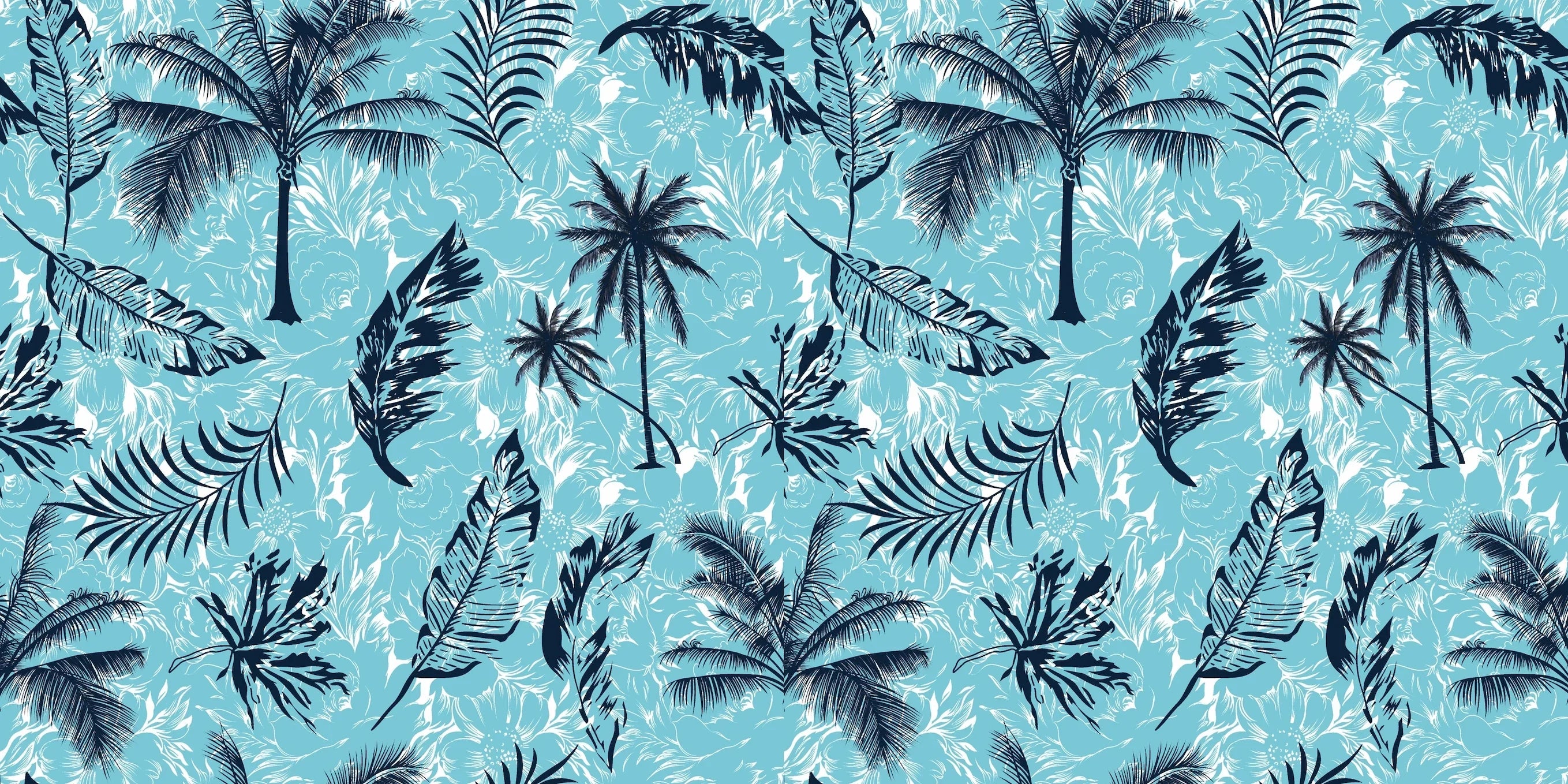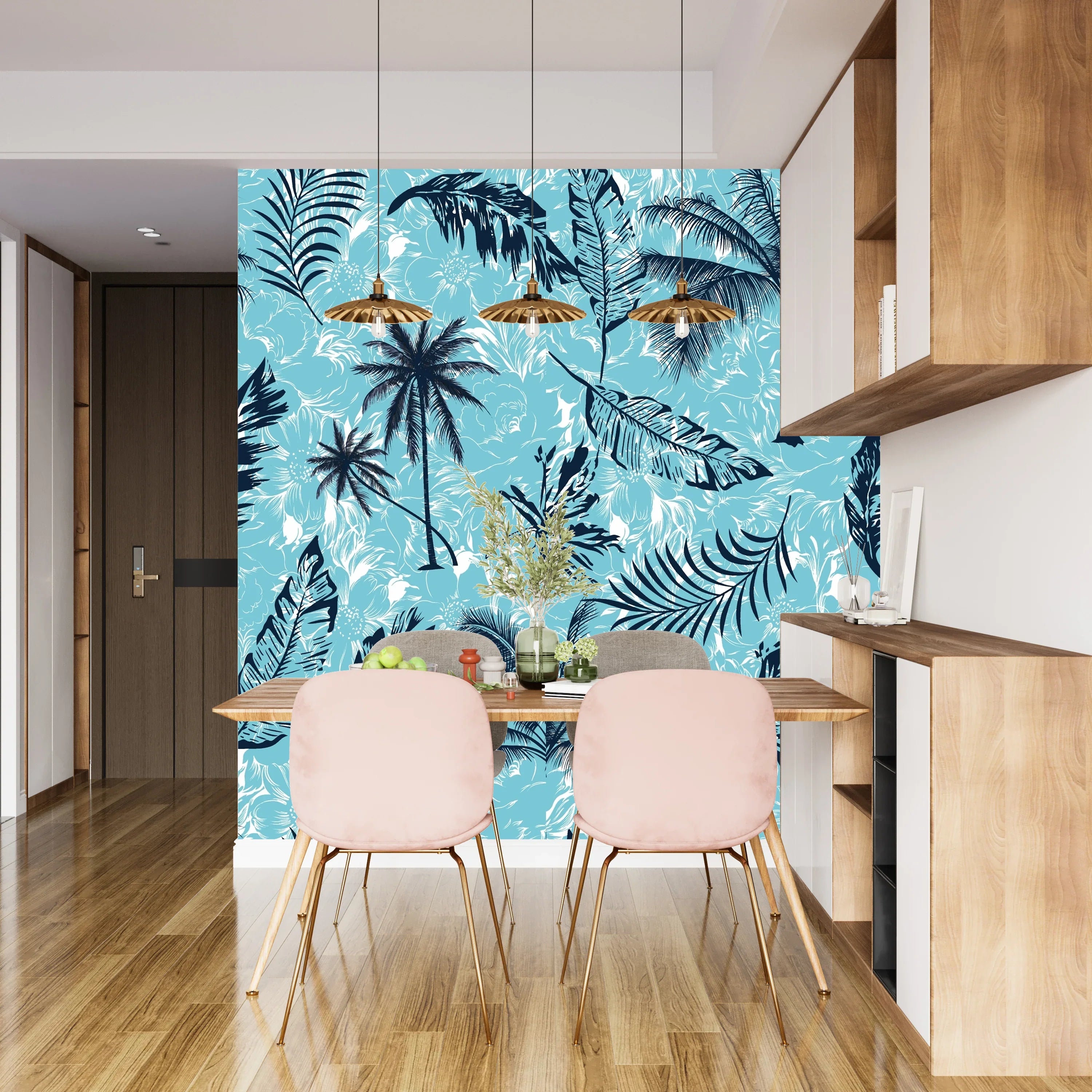 Tropical Plants, Blue Background Wallpaper, Seamless Pattern Mural, Oversized Custom Size Wall Art, Non-Woven, Non-Adhesive, Modern Wall Paper, Removable