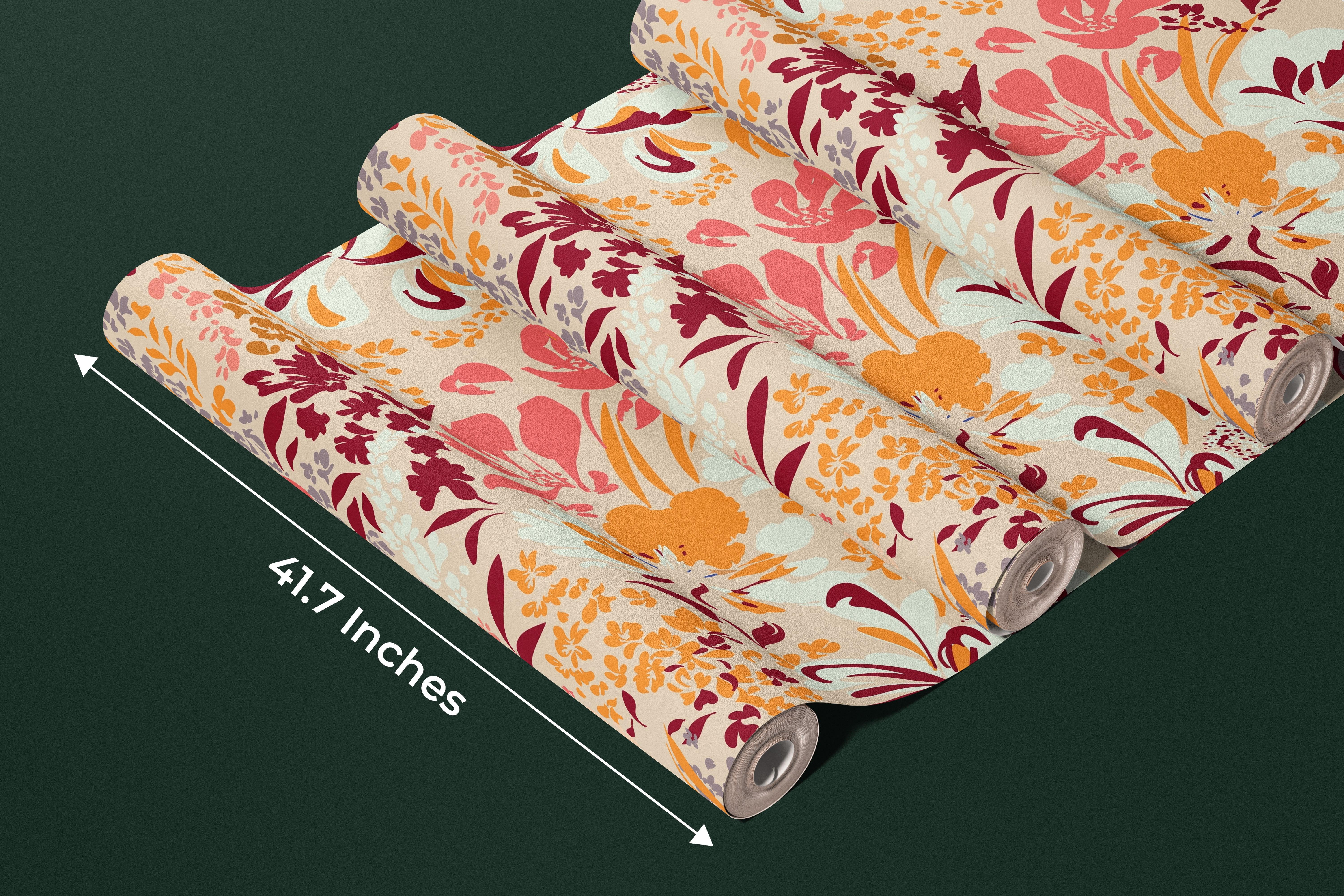Floral Red and Yellow Wallpaper, Seamless Pattern Mural, Oversized Custom Size Wall Art, Non-Woven, Non-Adhesive, Modern Wall Paper, Removable