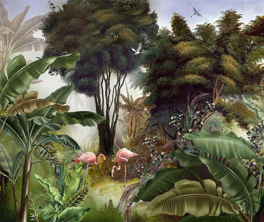 Flamingos Tropical Trees Wallpaper, Light Green Nature Wall Mural, Jungle Forest Scene, Non-Woven, Non-Pasted, Removable, Custom Exotic Wall Print Art