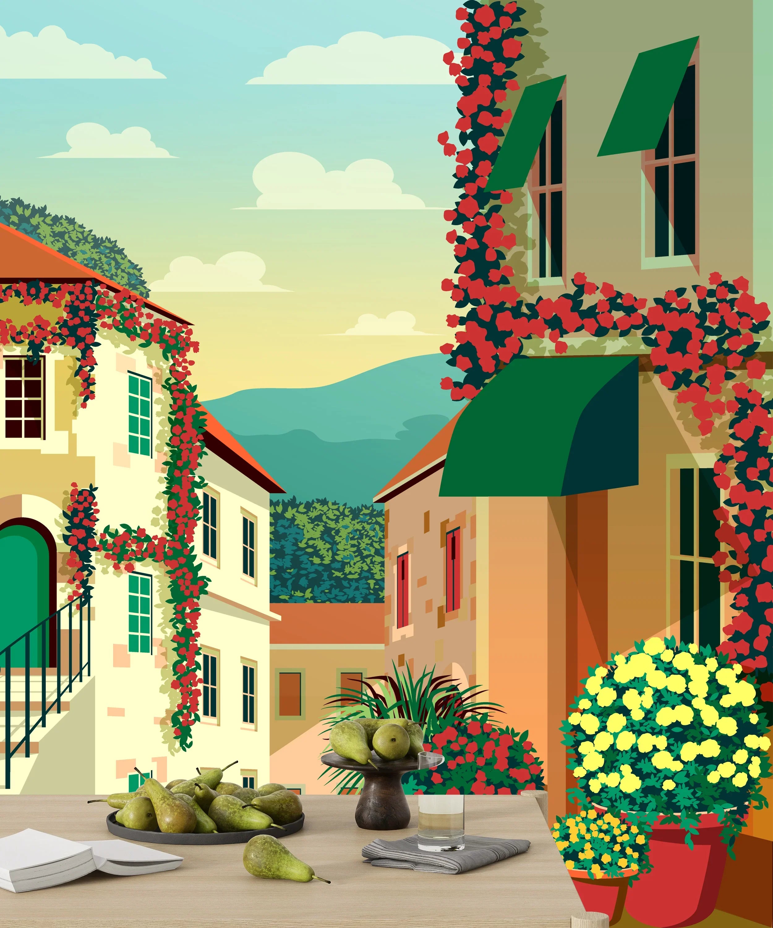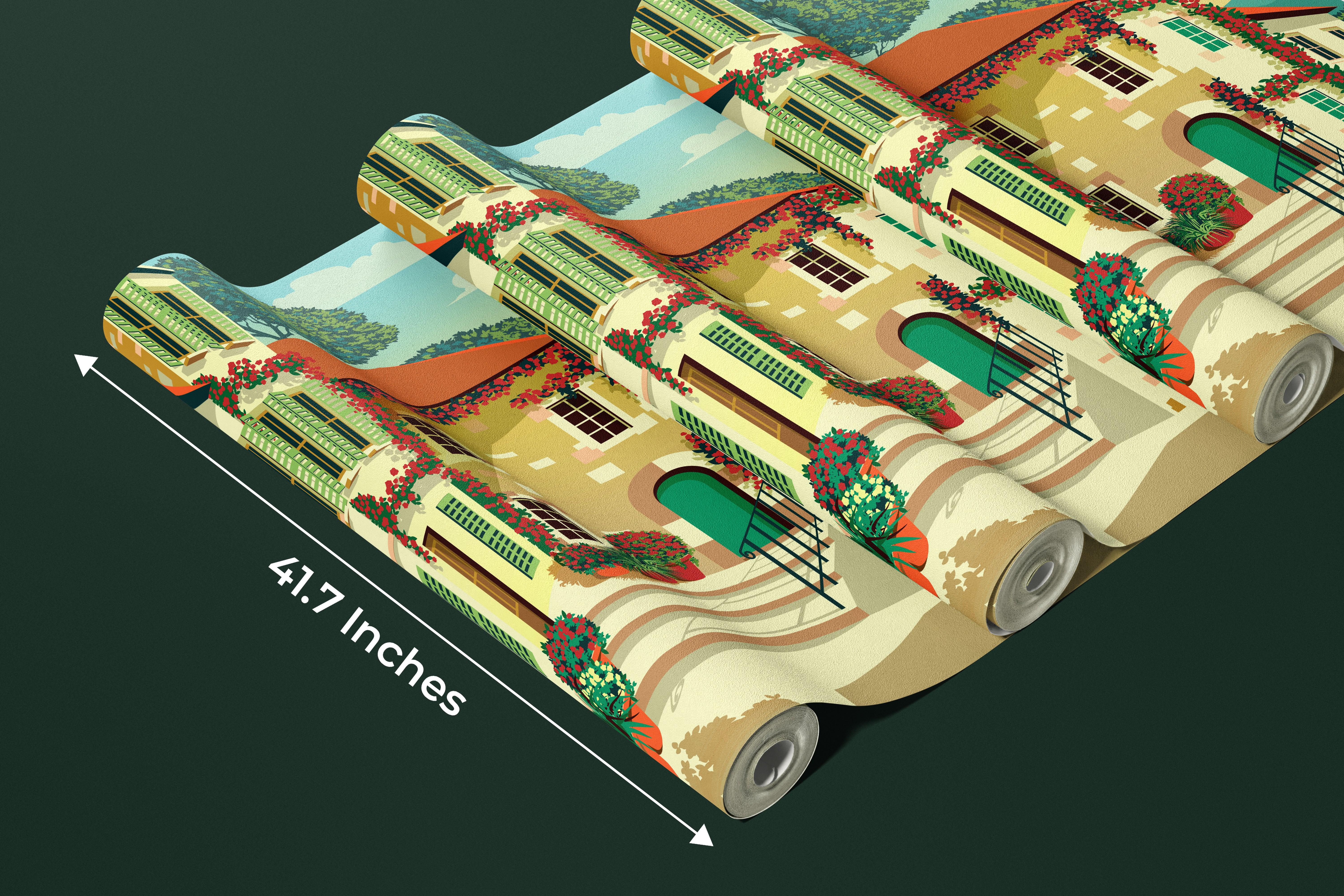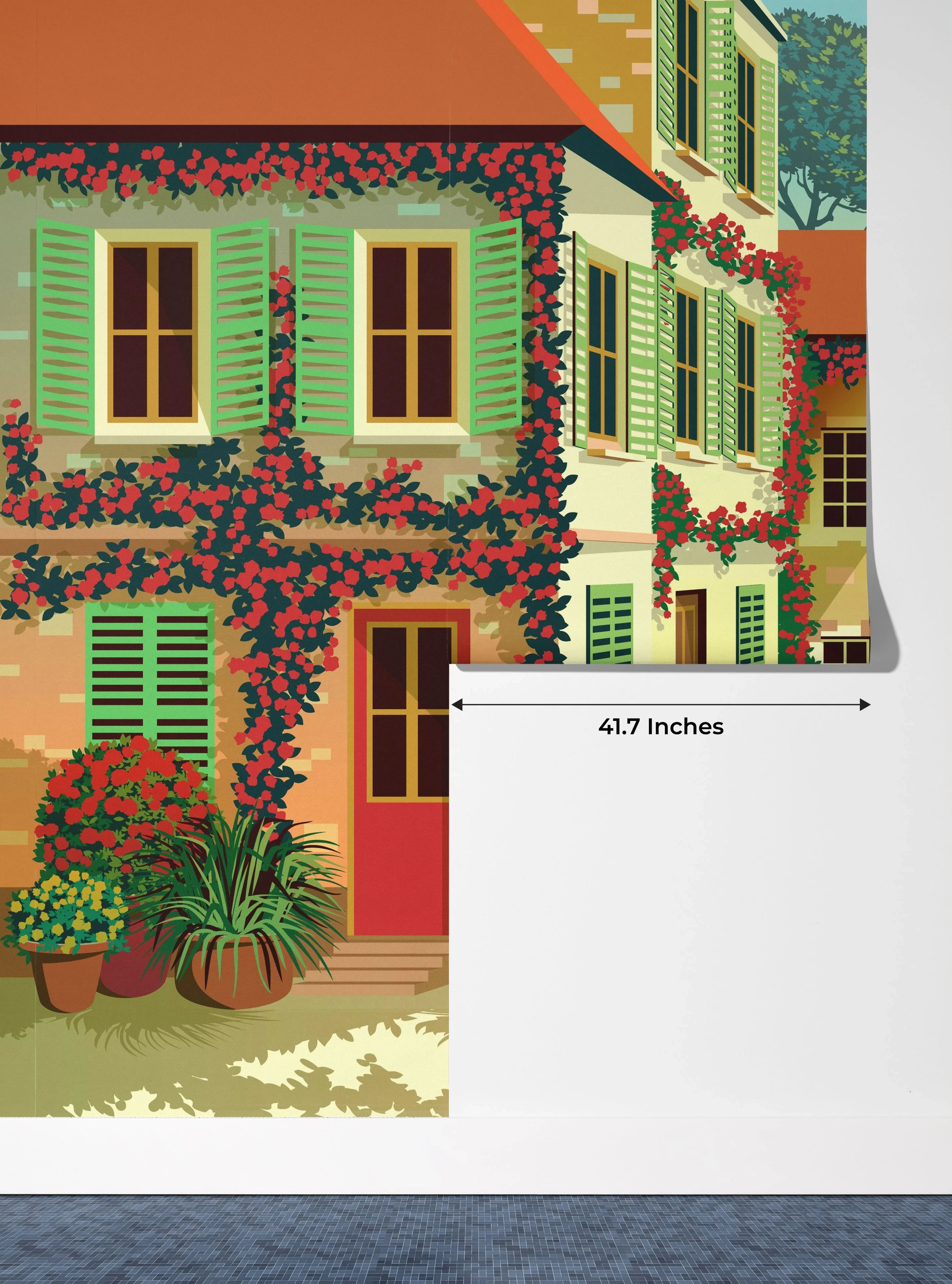 Village Square Wallpaper, Traditional Houses Mural, Oversized Custom Size Wall Art, Non-Woven, Non-Adhesive, Modern Wall Paper, Removable
