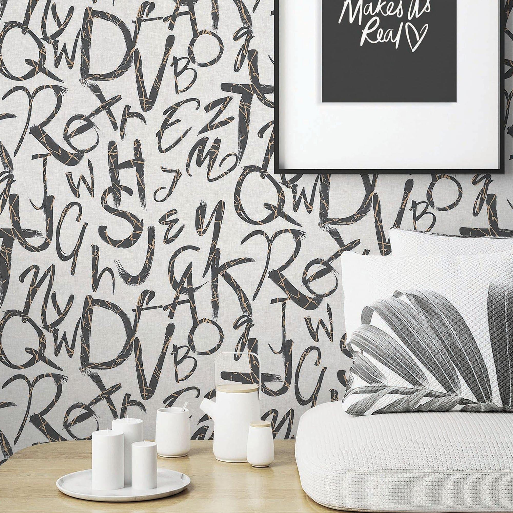 Modern Letters Wallpaper, Rich Textured Wallcovering, Traditional, Kids Room, Large 114 sq ft Roll, Washable, Alphabets, White N Black