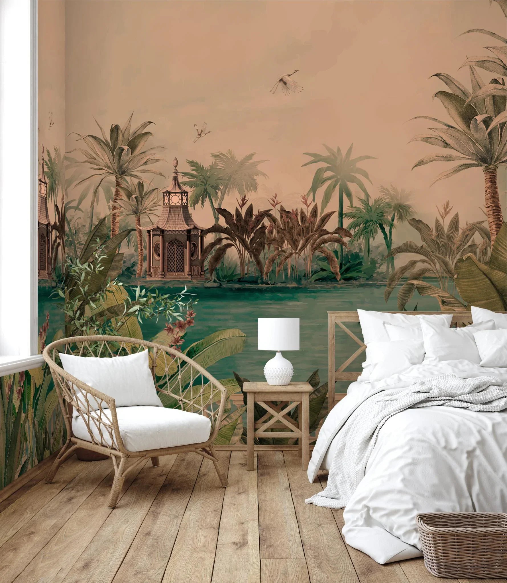 Nature Theme Wall Mural, Palm Trees Lake Scenic Wall Mural, Brown Jungle Scene Large Wall Art, Non-Woven, Non-Adhesive, Removable, Exotic Wall Paper, Washable