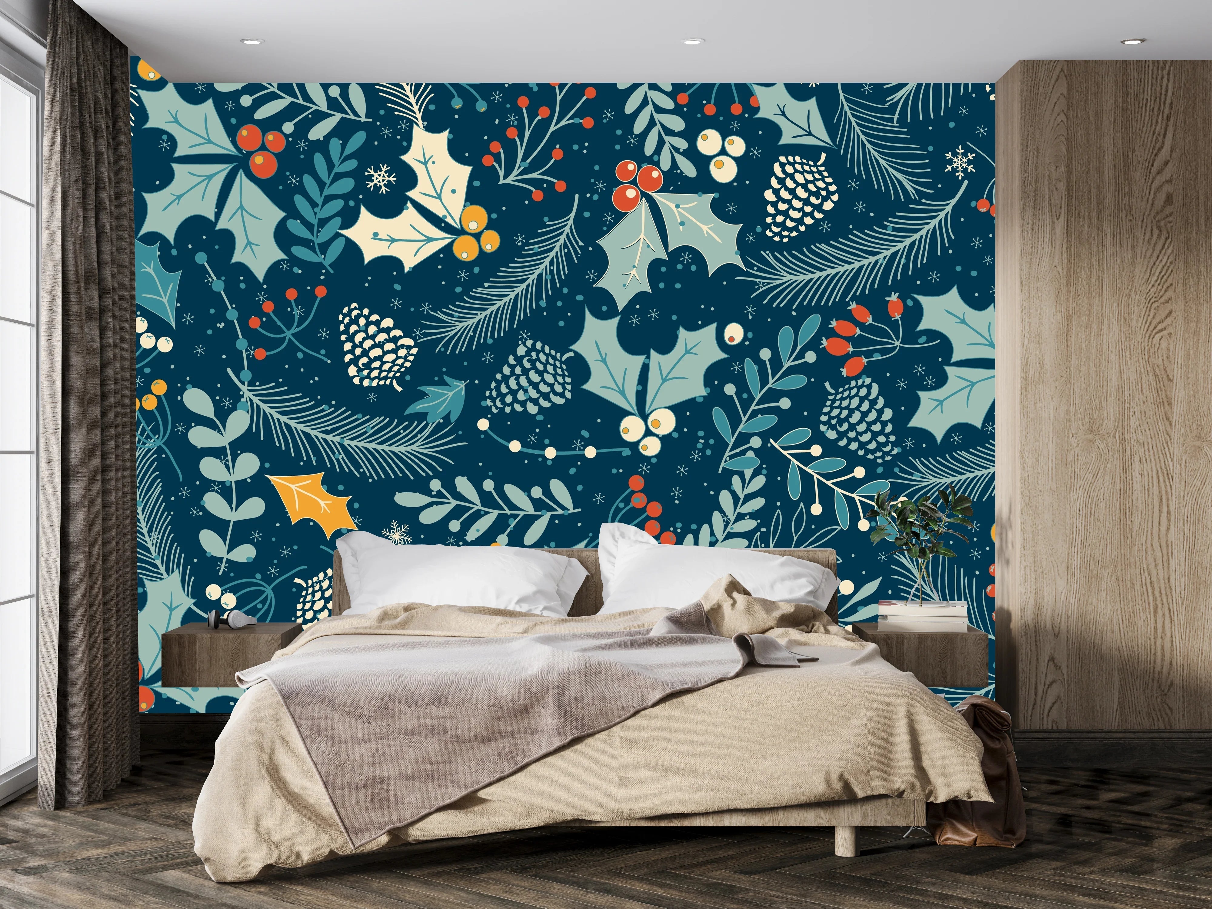 Leaves and Berries, Dark Blue Background Wallpaper, Seamless Pattern Mural, Oversized Custom Size Wall Art, Non-Woven, Non-Adhesive, Modern Wall Paper, Removable