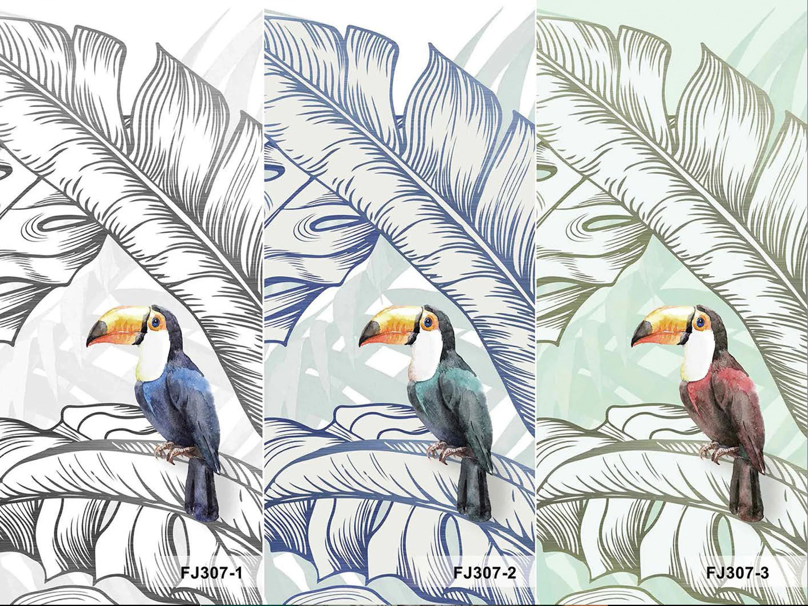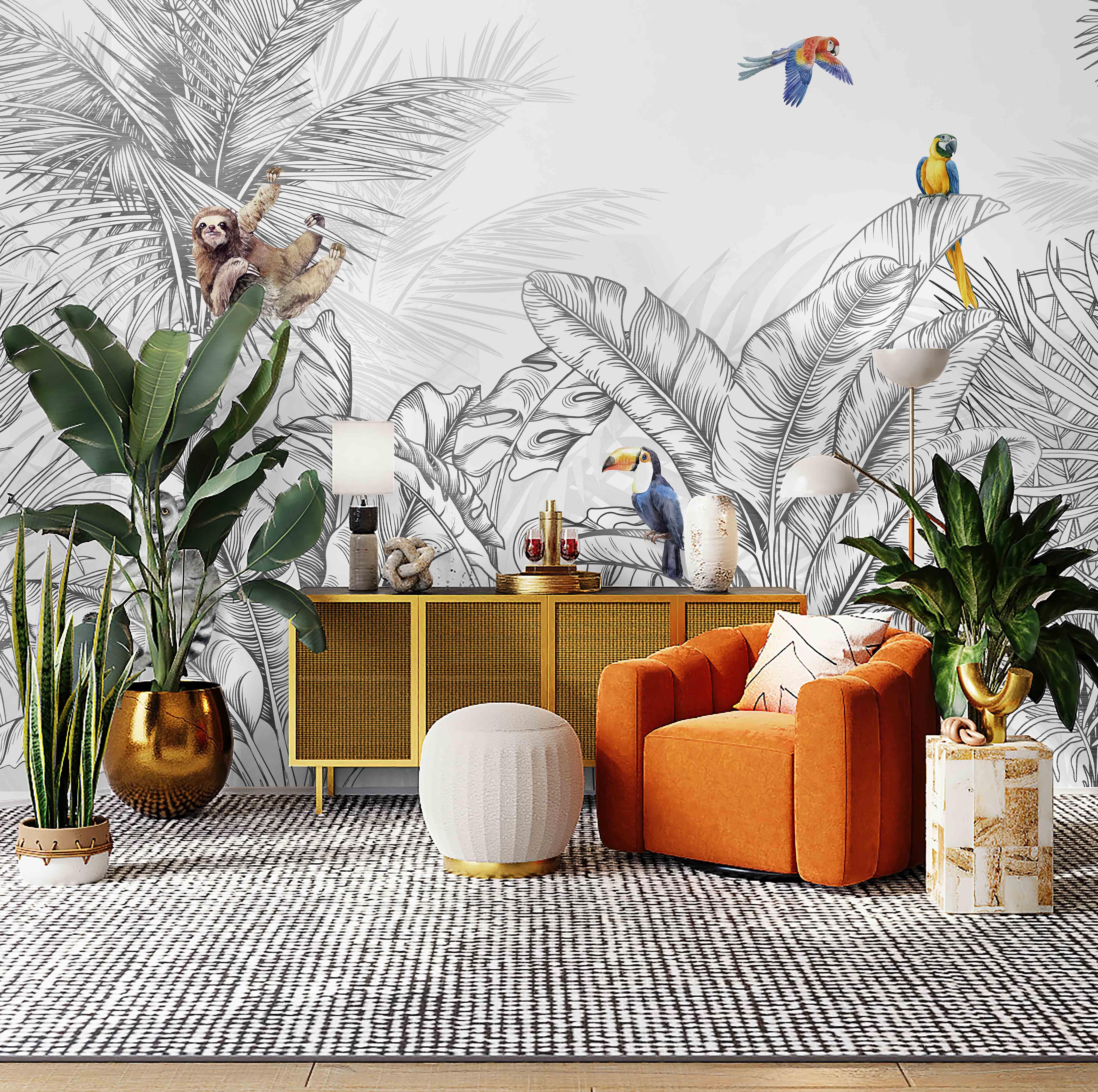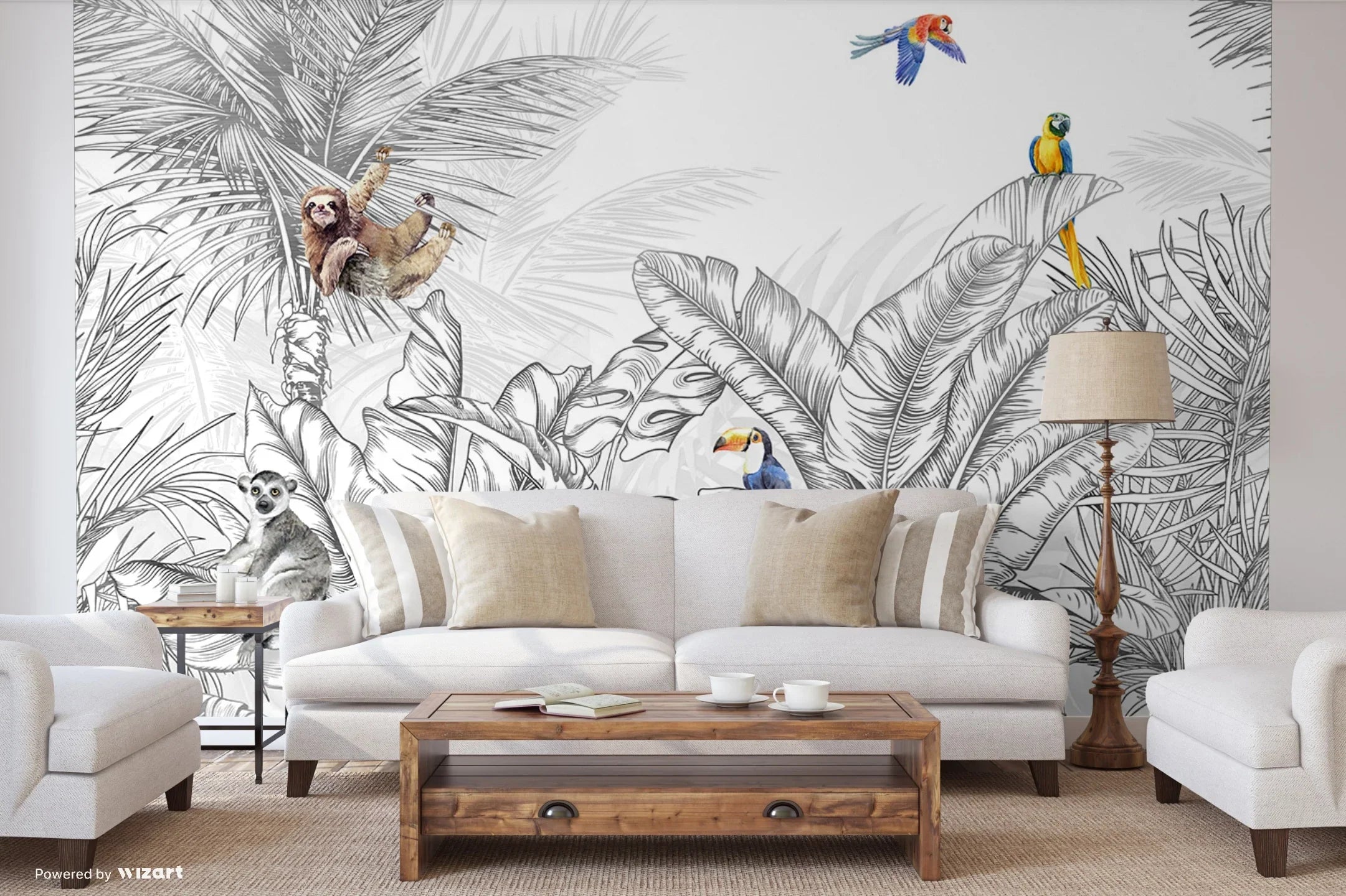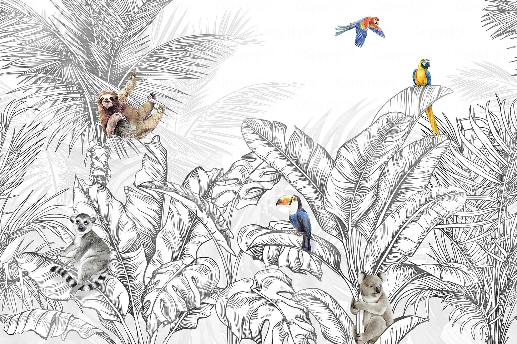 Tropical Animals Wallpaper, Blue Drawing Wall Mural, Custom Size Wall Covering, Non-Woven, Non-Pasted, Removable, Art