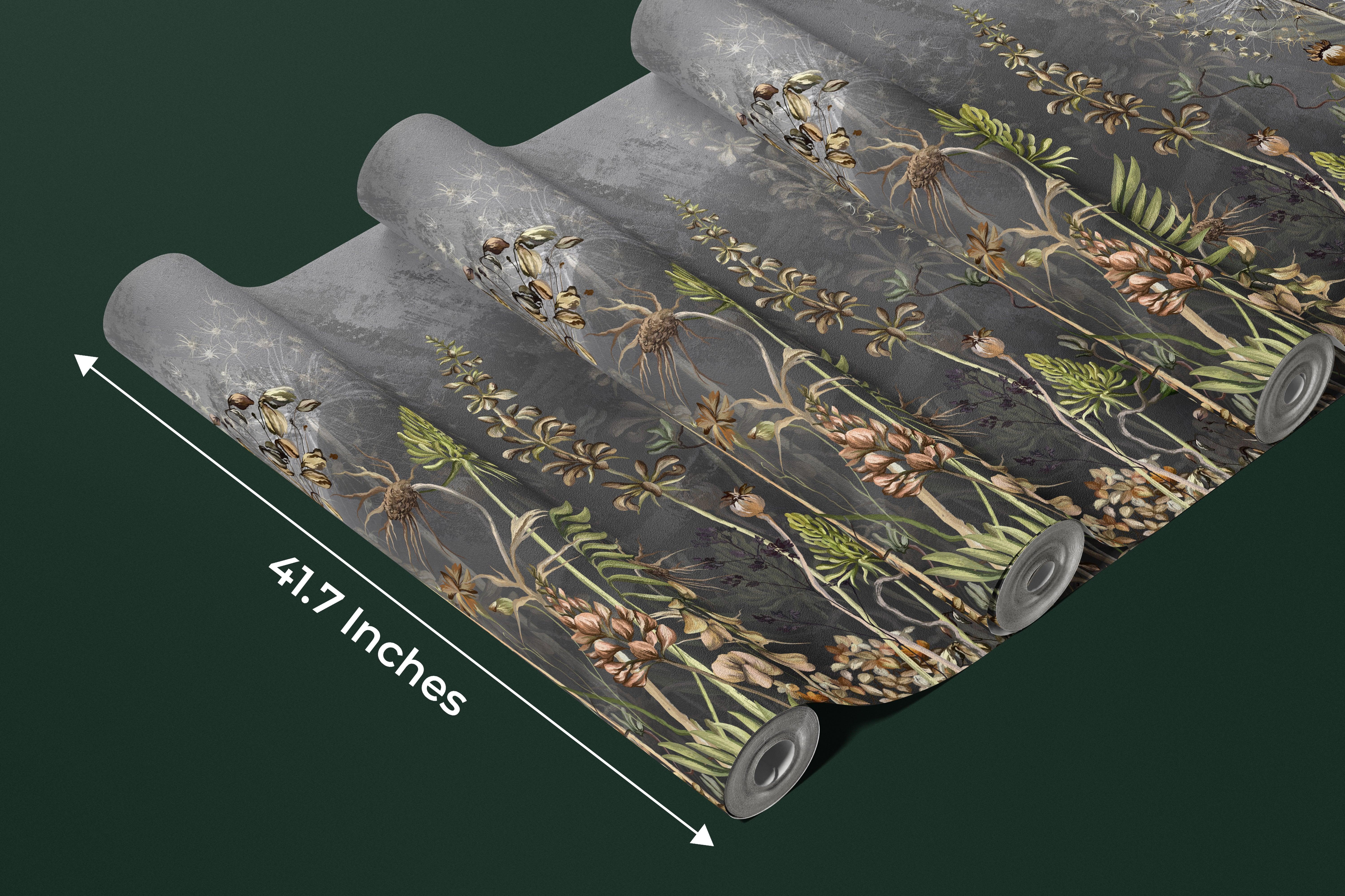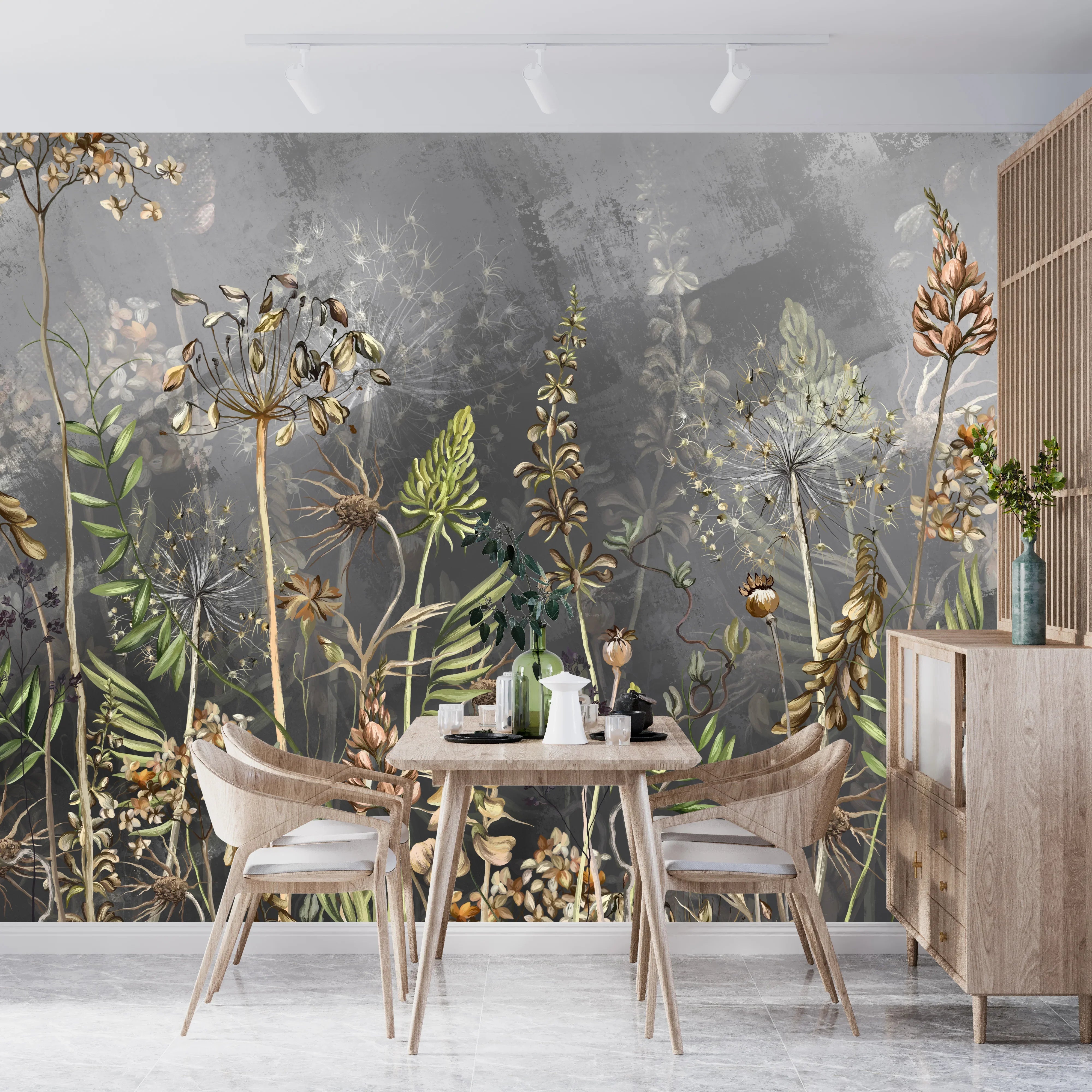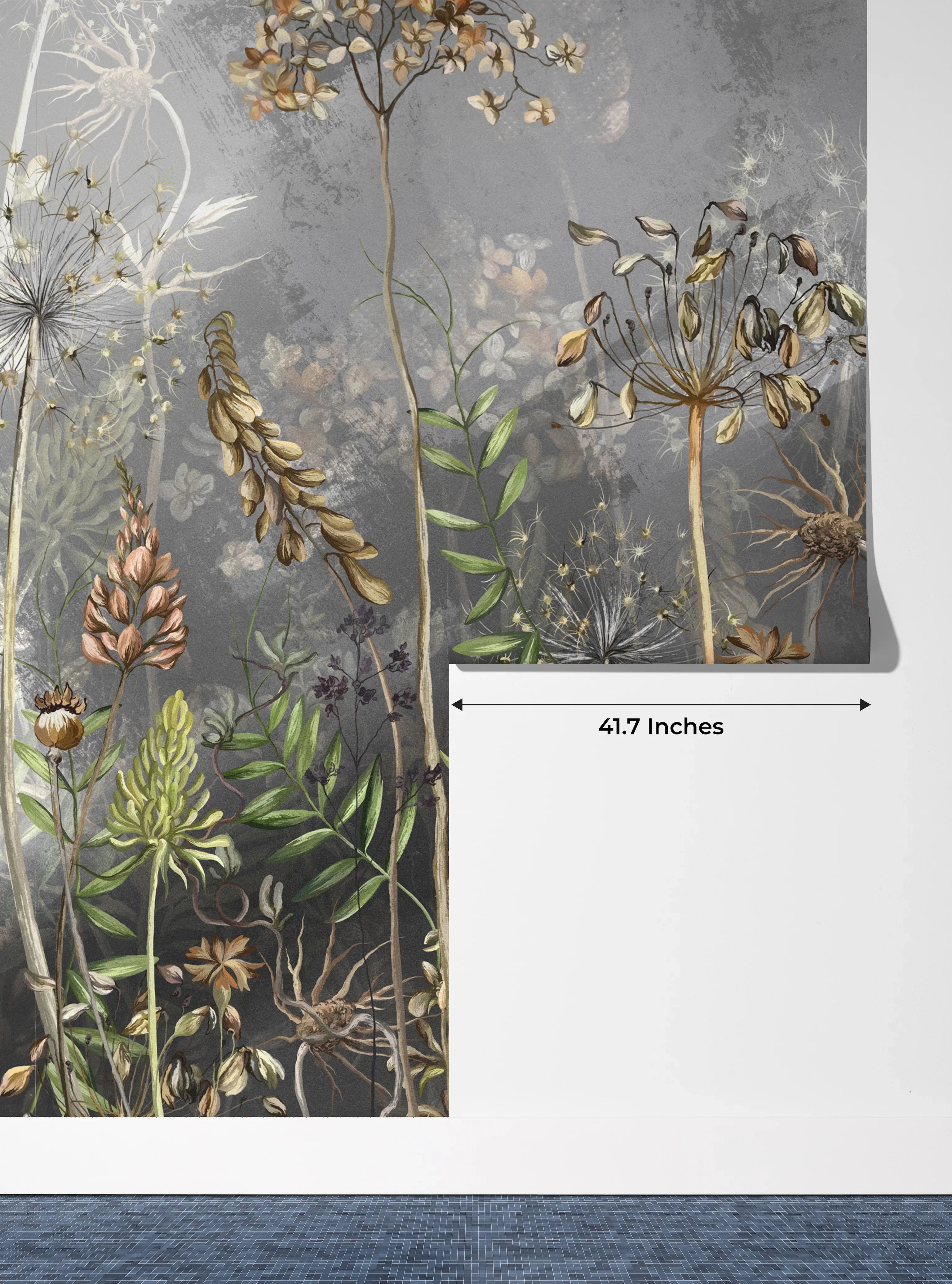 Dried Flowers Wallpaper, Grey Background Mural, Oversized Custom Size Wall Art, Non-Woven, Non-Adhesive, Modern Wall Paper, Removable